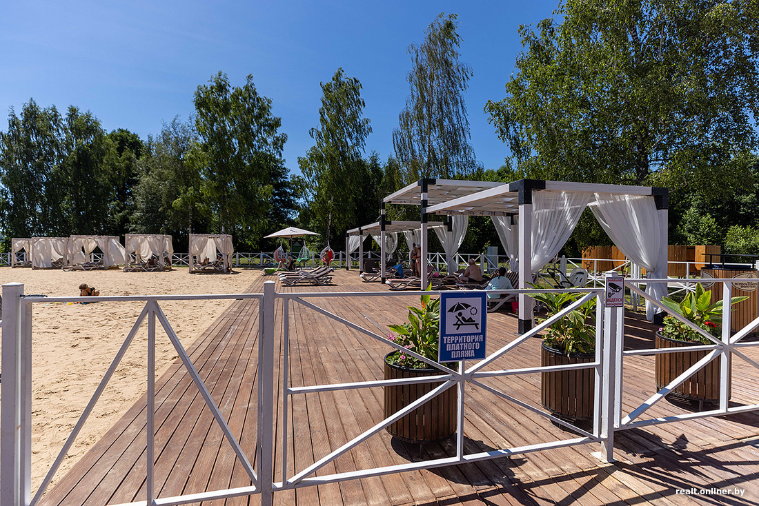 Сам пляж разделен на две части. Первая, что называется, для всех — прийти на нее может любой желающий. Можно понежиться под солнцем на своем полотенчике или даже в шезлонге — со своим сюда пускают без проблем. А если не хочется заморачиваться, шезлонг и (или) пляжный зонт можно взять напрокат (по будним за час попросят 5 рублей, по выходным — 10).