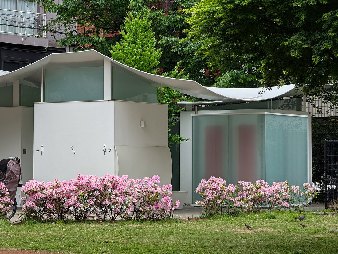 Сигэру Бан, архитектор, обычно работающий с переработанной бумагой, бамбуком, тканью и другими нетрадиционными для строительства материалами, на этот раз предложил полностью прозрачные и очень футуристические уборные. По словам автора, перед использованием таких объектов у среднестатистического посетителя обычно возникают два вопроса. Первый — занят ли туалет? Второй — насколько там чисто. Использование стекла позволило давать ответ сразу на оба. Конечно, закономерно возникает и третий вопрос: а как быть в таком случае с необходимой приватностью? Бан превратил свои работы в аттракцион. Он применил умное стекло, которое становится полностью матовым, непрозрачным, когда объект закрывается на замок.