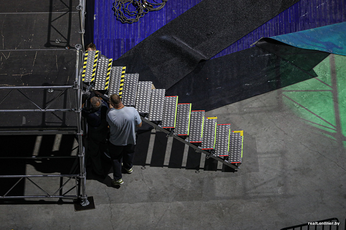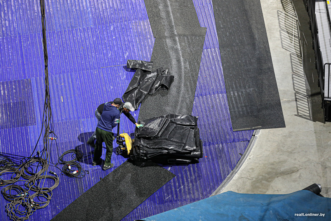 — Высота от плиты до вантового покрытия равна высоте девятиэтажки, — объясняет Андрей. — Внизу сейчас кипит работа. Мы попали в самый пик активности, когда подрядчики монтируют сцену для концерта: он пройдет буквально на днях. Когда мероприятие закончится, специалисты разберут сцену, снимут термофлекс, который защищает лед от повреждений, и уже через пару дней здесь пройдет хоккейный матч. Иногда рабочим отводят на все буквально одну ночь, чтобы подготовить площадку к новому мероприятию. За 15 лет этот процесс отработан до мелочей.