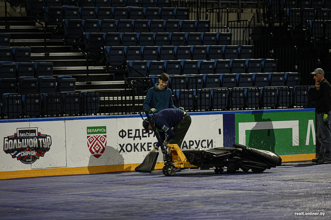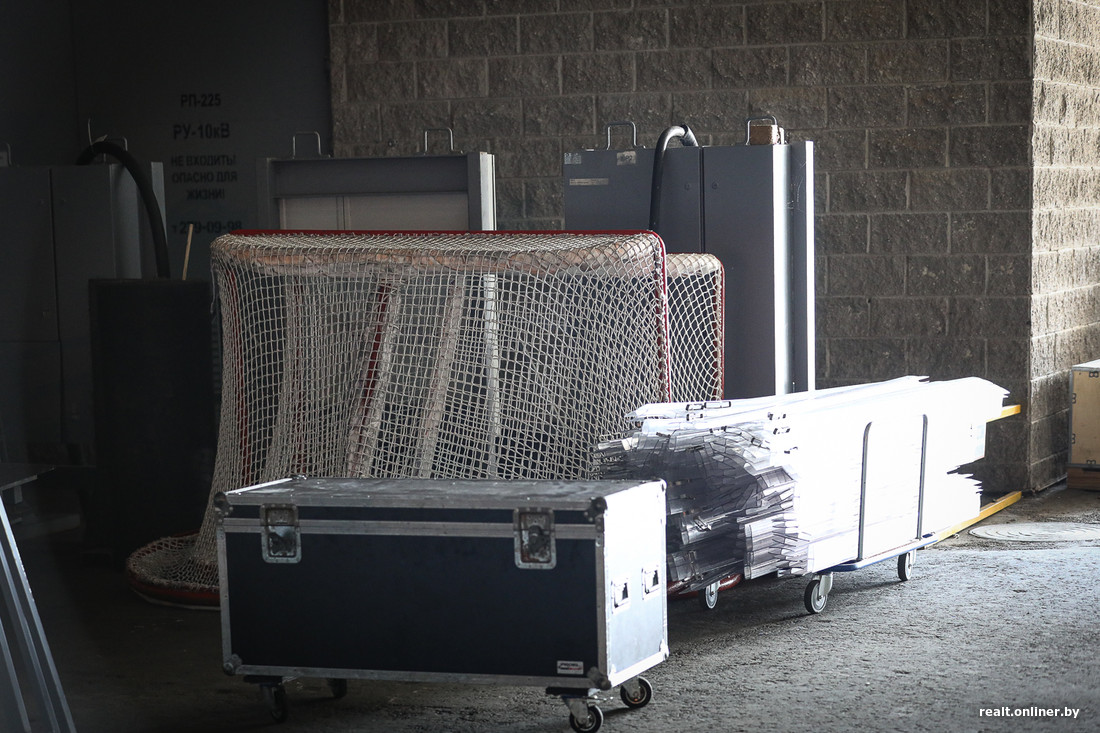— Перед нами около 10 500 «квадратов» льда, — продолжает удивлять Андрей. — Здесь есть стандартная конькобежная дорожка, длиной около 400 метров и шириной 11,5 метра. В центре — две хоккейные коробки: одна европейского стандарта, другая — канадского. Они никогда не пустуют, даже когда заканчивается сезон. Лед топят и на его место кладут сначала ДСП, затем ковролин. После этого площадка превращается в место для разного рода ивентов и может легко конкурировать с «Белэкспо».