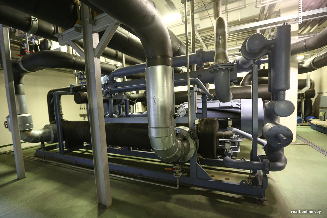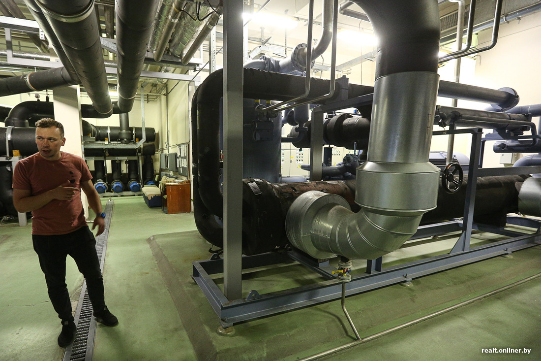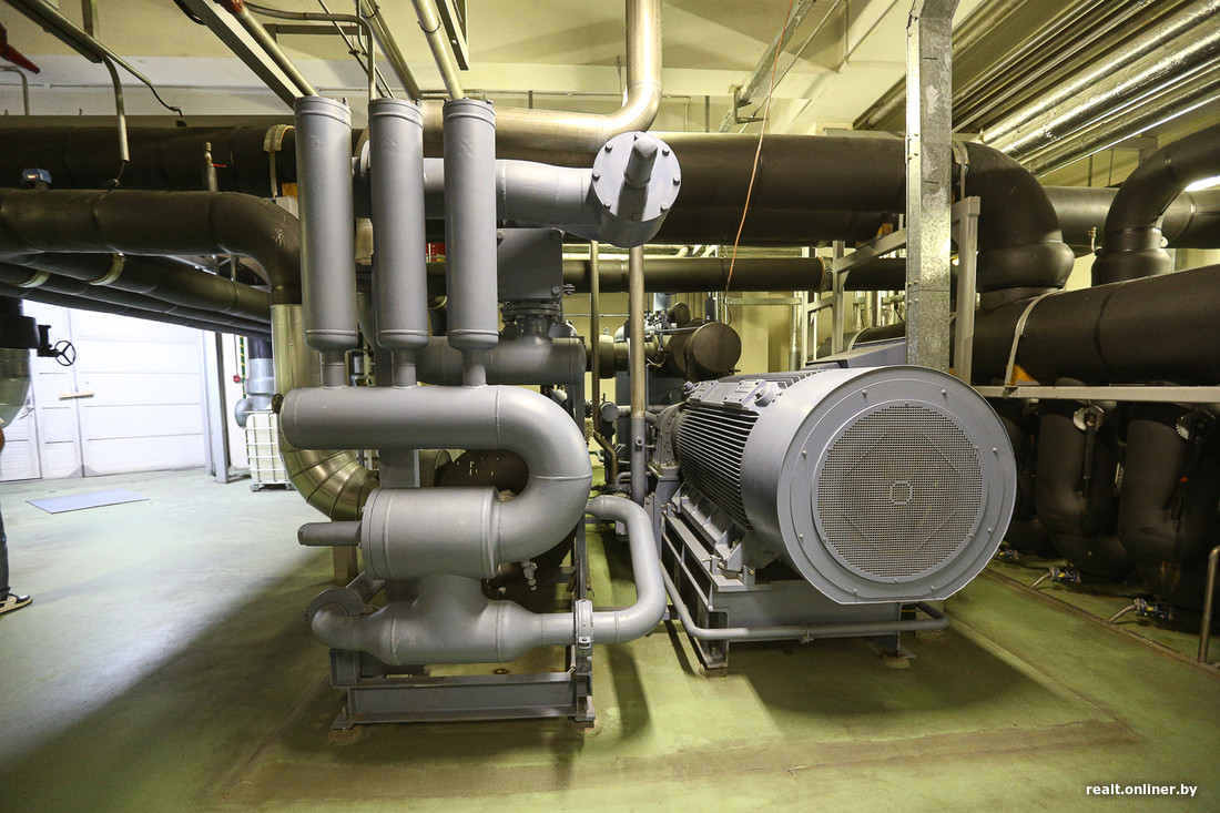 После прогулок по основным объектам спорткомплекса заходим туда, где не ступает нога простого смертного, — на станцию кондиционирования. Посторонним сюда вход запрещен, но нам можно. Нашим проводником в мир сложных и дорогих инженерных конструкций, которые отвечают за функционирование ледовых полей, стал Павел. Он работает в должности начальника отдела эксплуатации систем холодоснабжения не первый год, поэтому на пальцах может объяснить, как здесь все устроено.