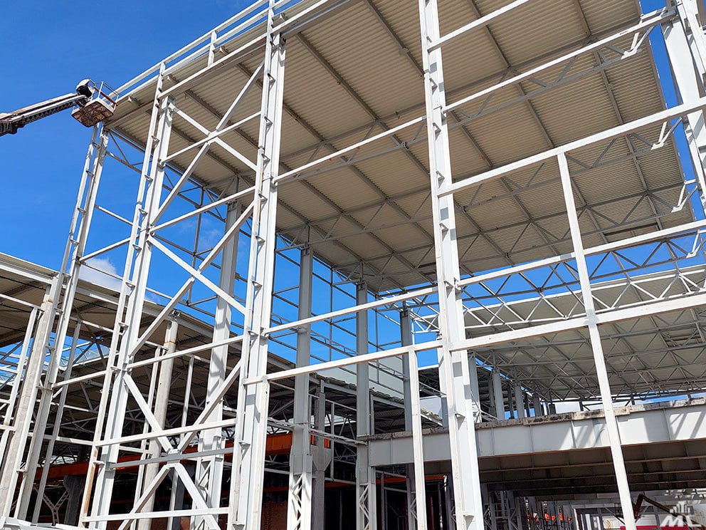 Степень готовности объектов разная. Работа кипит по всем направлениям: монтируют сэндвич-панели фасадов, производят сварку металлоконструкций, бетонирование полов и перегородок, отделку, установку мостовых кранов в цехах. Ведется прокладка наружных сетей и частично — благоустройство.