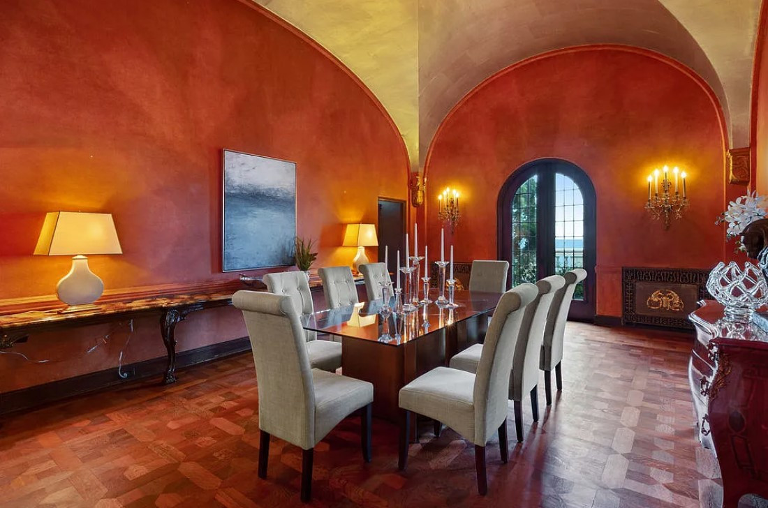 Общая площадь особняка чуть не дотягивает до 750 квадратных метров. Среди 18 комнат, размещенных на трех уровнях, шесть спален и шесть с половиной санузлов (шесть полноценных ванных комнат и один отдельный гостевой туалет). Помимо этого, на первом этаже находятся фойе, большая гостиная с камином и выходом в сад, столовая с кухней, оснащенной всем современным оборудованием, два кабинета, библиотека и еще одна гостиная с баром. Второй этаж, помимо спален и гардеробной, занят сауной. На третий этаж вынесена специальная игровая комната также с баром и кладовые. Кроме этого, в распоряжении у собственника 460 квадратных метров своего открытого пространства на крыше, включая озелененный сад с работающим фонтаном, террасы и лоджию в стиле Ренессанса.