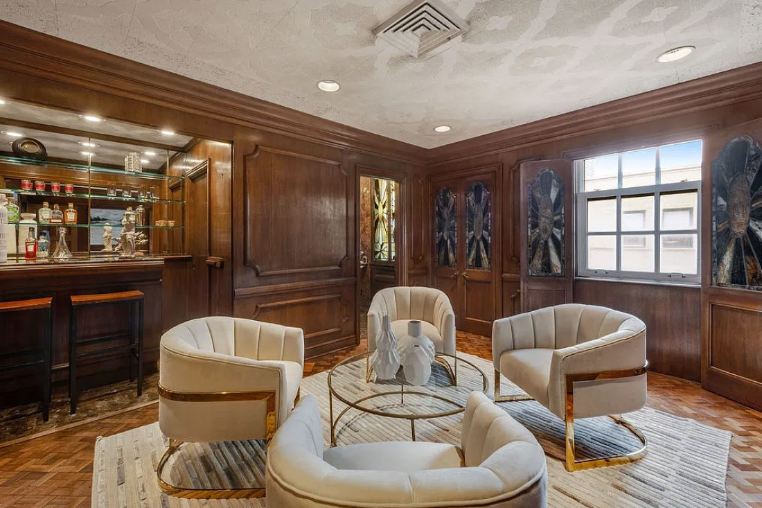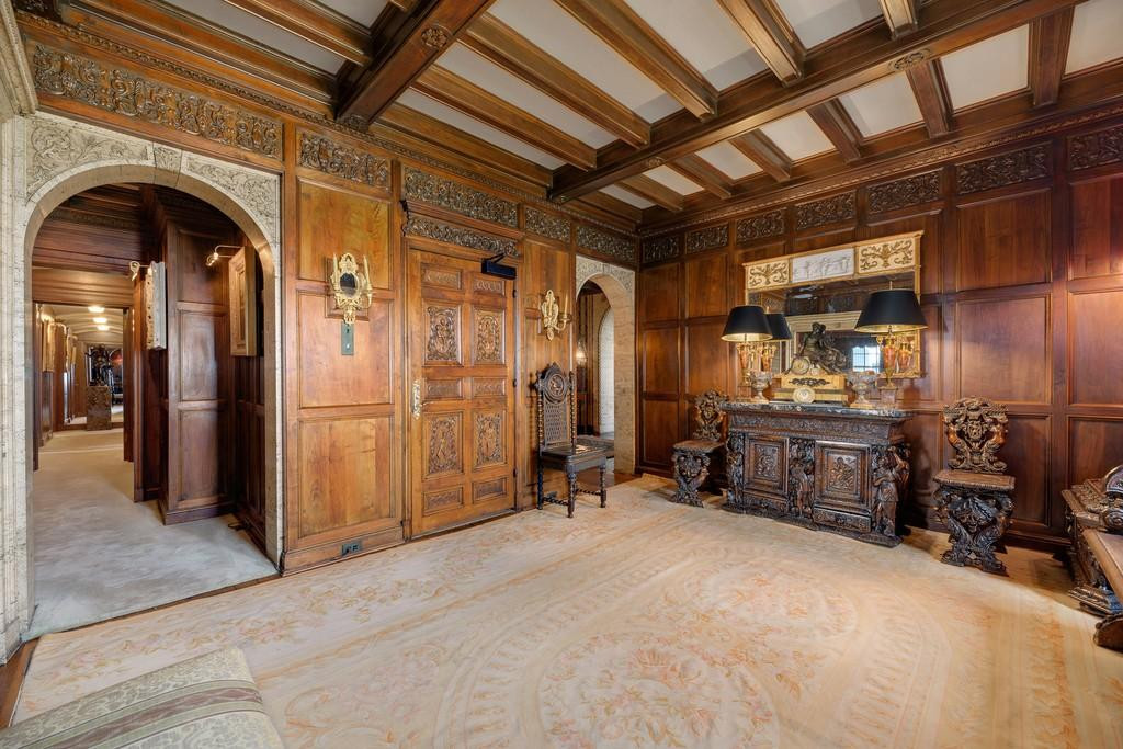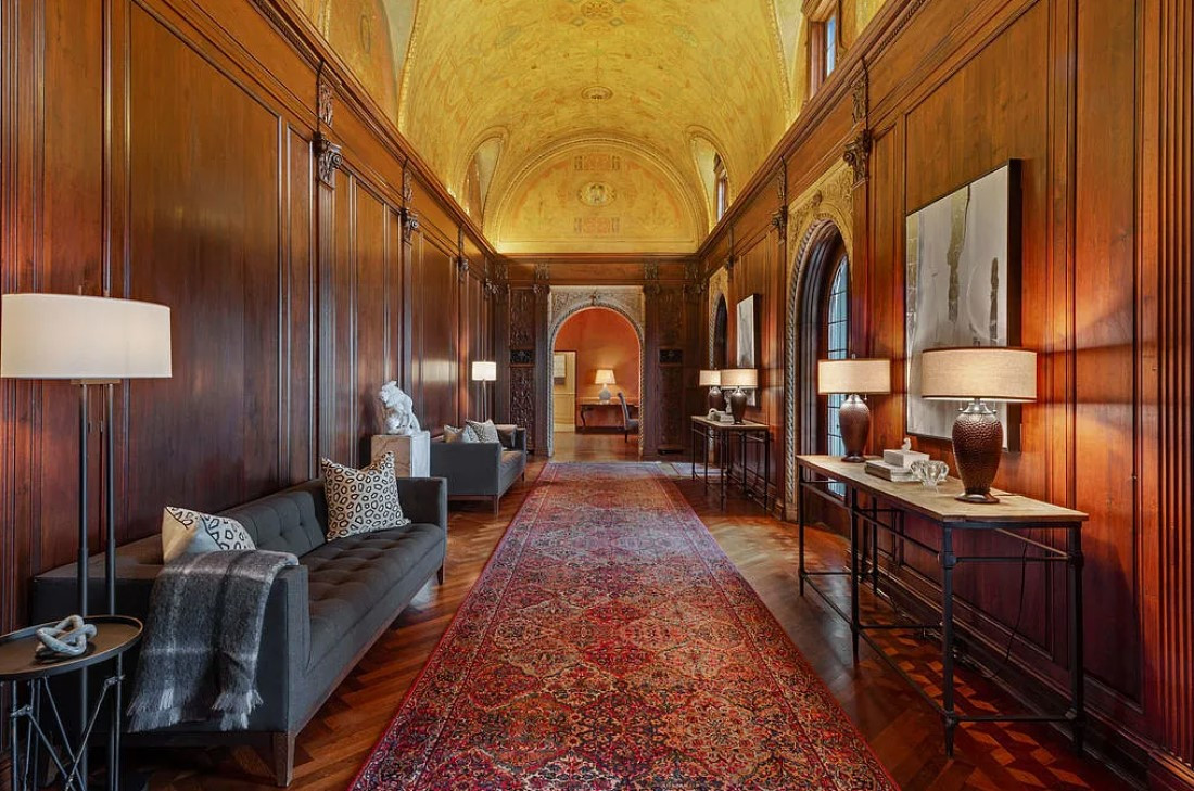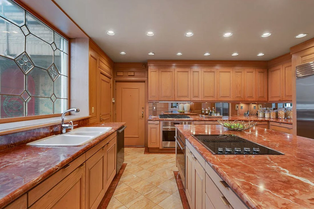 Мрамор, известняк, деревянные панели из орешника, начищенная бронза, витражи в окнах. В пентхаус ведет собственный частный лифт из вестибюля башни на первом этаже.