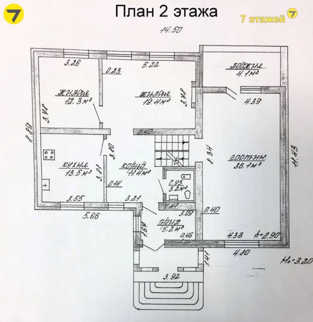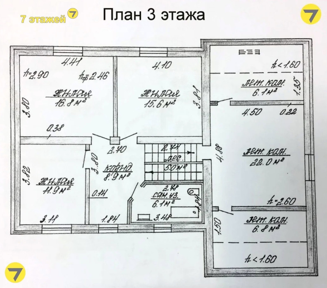 В коттедже предусмотрено семь жилых комнат, два санузла и большая лоджия. А на цокольном этаже при желании можно разместить баню или бассейн.