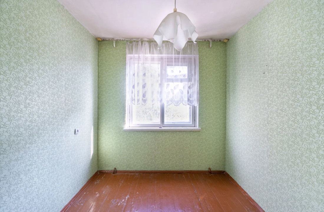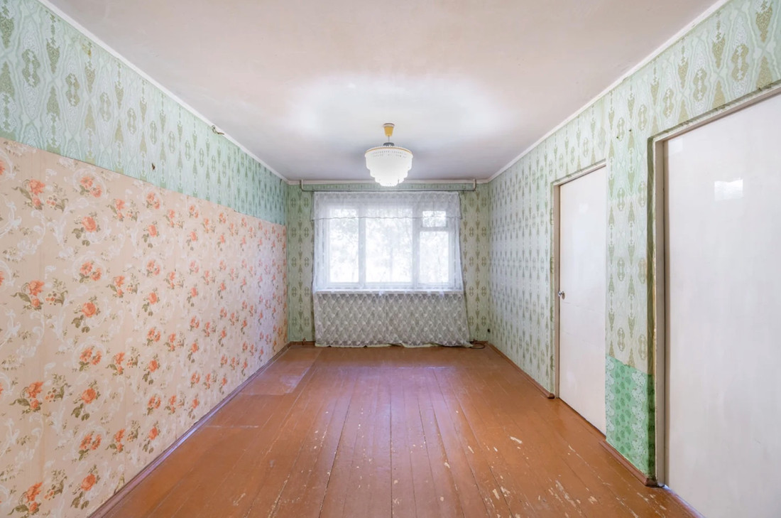 Ну а за $62 000 по курсу рядом со станцией метро «Тракторный завод», а именно на улице Стахановской, можно купить пустую трешку. Здесь вас ждут дощатый пол, обои в цветочек, газовая плита и полное отсутствие мебели. Но зато расположение уж точно лучше, чем у предыдущих вариантов.