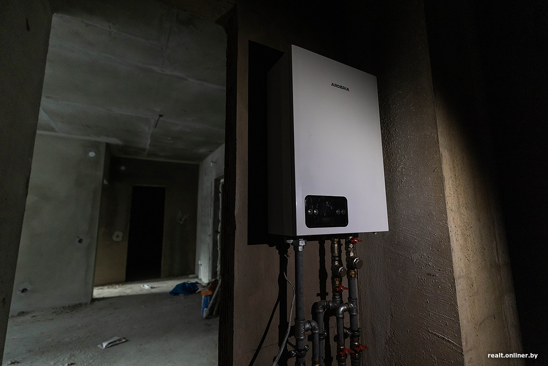 — Песчано-цементные стяжки по квартирам сделаны, межкомнатные перегородки тоже имеются, — рассказывает представитель застройщика. — Разводка электрики и штукатурные работы в 70% квартир уже сделаны. Установлены стояки, унитазы и водяные полотенцесушители, а также бойлеры на подогрев воды. Активно идет обвязка электрокотлов.