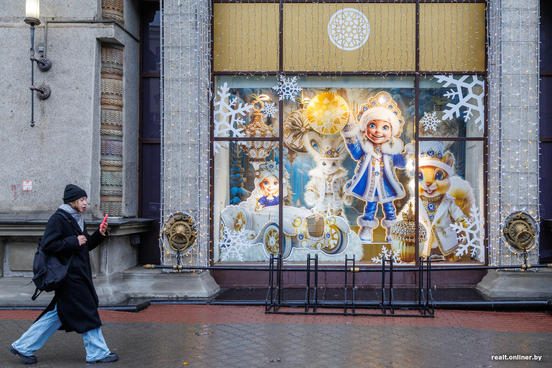 Один из главных универмагов столицы готов к новогодним праздникам. Сегодня витрины ГУМа засияли огнями, нарисованными сапфирами и бриллиантами, намекая о том, что уже через пару месяцев белорусы шагнут в новый год. На этот раз за внешними стеклами универмага поселились снегурочки (аж 17 штук), белка и кролик, можно заметить также карусель с необычными деталями, меховые облака и многое другое. Придумать необычные образы для оформления витрин дизайнеру ГУМа Юлии Евсюковой помог искусственный интеллект.