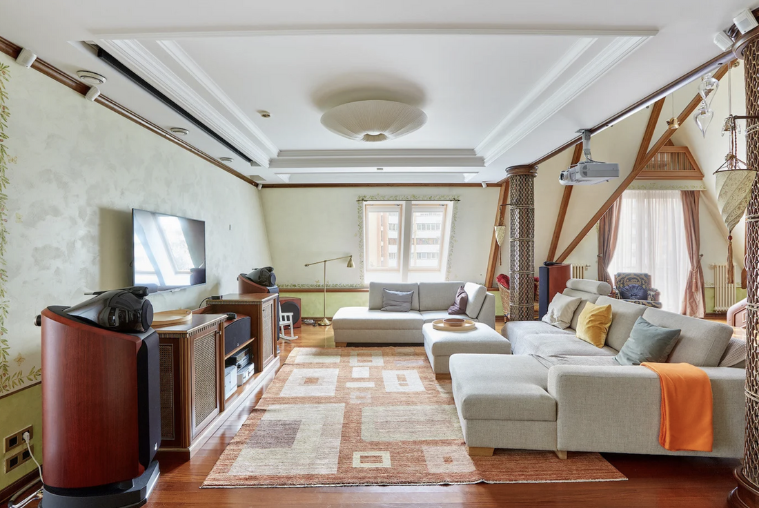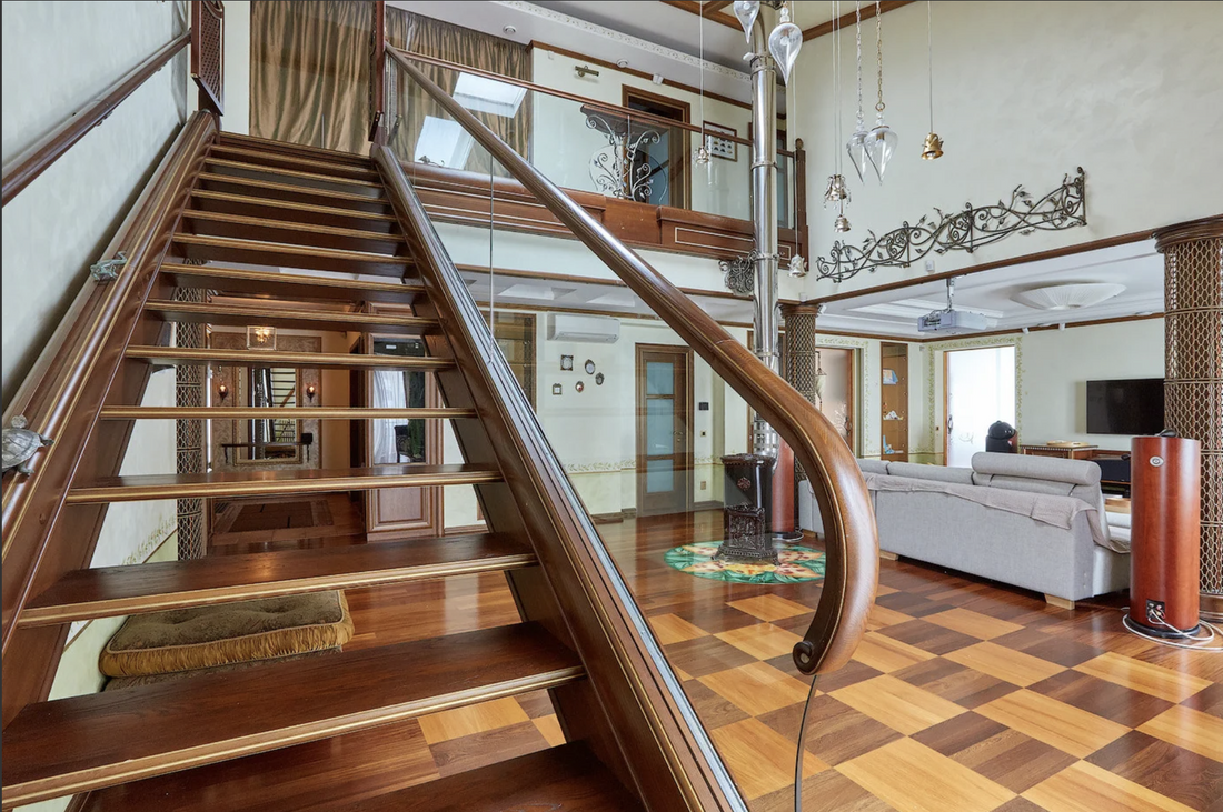 Интерьер в квартире сложно назвать современным: он застыл где-то в нулевых, но имеет свою изюминку. Большое количество элементов из дерева (в том числе лестница), камин с живым огнем, оригинальные кресла, потолок, оформленный деревянными балками, — все это вполне могло сойти за апартаменты Шерлока Холмса, если бы он жил не в Лондоне, а в столице Беларуси.
