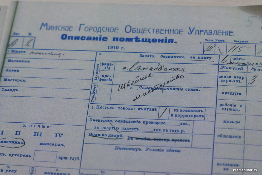 По описаниям помещений за 1910 год можно представить жильцов. Например, тогда здесь снимали квартиры учительница Чехович, помощник пристава Дащенко, а в мезонине у минчанки Лапковской была крохотная швейная мастерская.