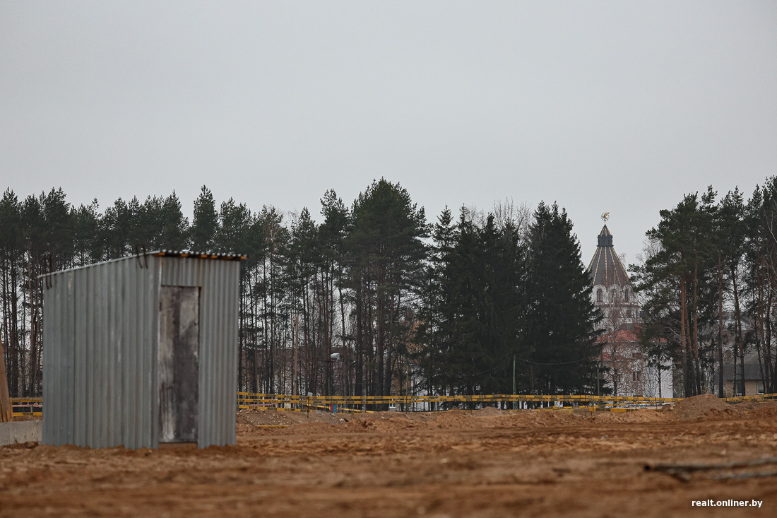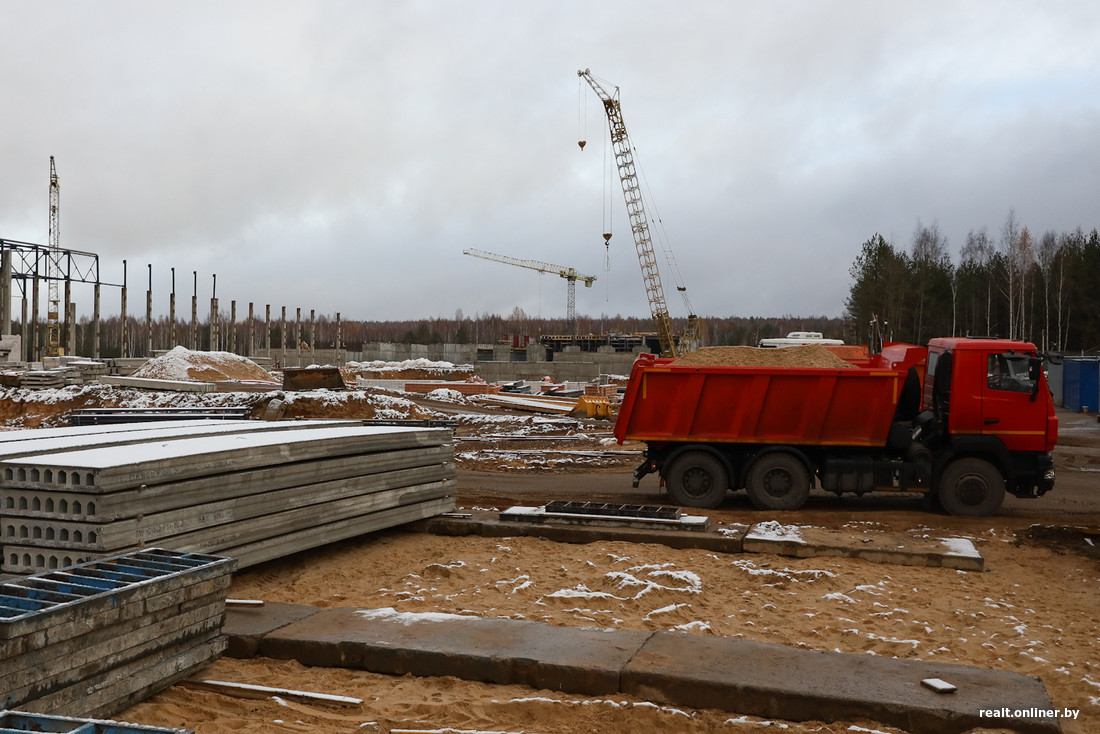 Минуло полгода. На стройке появились краны, грузовая техника, строительный городок. Со стороны не видно, но в одном из котлованов уже формируется фундамент (соответствующей фотографией еще в конце июля делился «Минскстрой»). Примечательно, что ждать бетонных панелей или каменной кладки здесь не стоит. Больницу планируют возвести из легких стальных тонкостенных конструкций. Это должно значительно ускорить процесс (если с поставками основного строительного материала, конечно, не возникнет проблем).