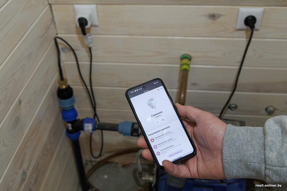 — В загородных домах бывает проблема: промерзает труба, по которой вода поступает из скважины в дом. У меня в обычную трубу ПНД (полиэтилен низкого давления. — Прим. Onlíner) на глубину промерзания внедрен греющий кабель. Он подключен к умной розетке, которая связана с приложением умного дома. Когда на улице ноль или минус, автоматически включается греющий кабель через эту розетку, что не дает воде замерзнуть.