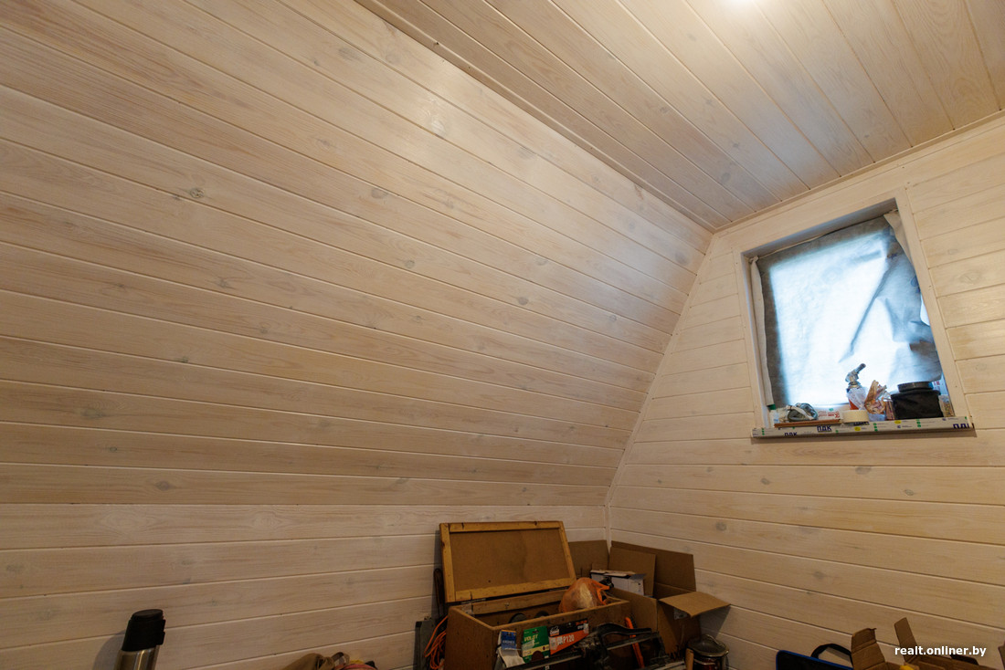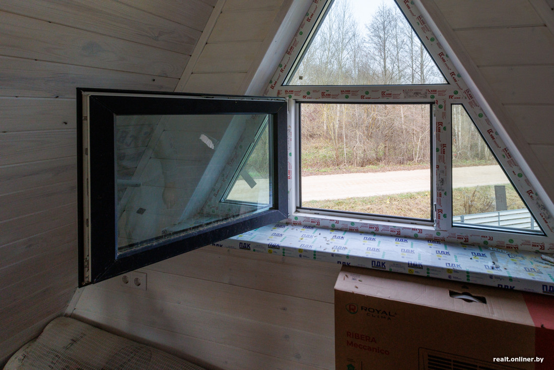 Сам треугольный дом уже близок к готовности. Есть гостиная со вторым светом, отдельная комната на первом этаже, санузел, а еще пространство на втором уровне, где будет спальня.