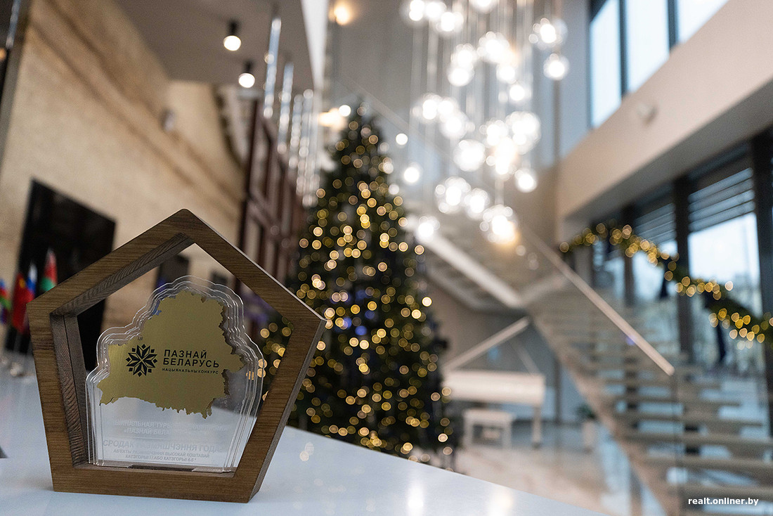 Двигаемся в сторону отеля. Здесь красивый и даже немного торжественный интерьер, панорамные лифты с видом на город... На первом этаже находится зона ресепшен (здесь уже поставили елочку), на втором — несколько конференц-залов. Дальше, вплоть до десятого этажа, — номера. Всего их 135. Все они оформлены в современном минималистичном стиле и имеют разную категорию: есть как стандарт, так и президентский люкс. Стоимость за ночь стартует от 250 рублей и заканчивается на отметке в 2000.