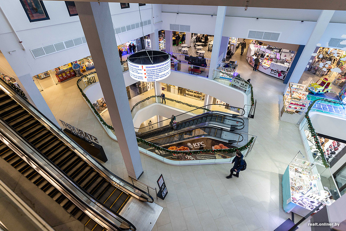 Само здание имеет продолговатую форму и достаточно типичную для подобных объектов архитектуру — такую вы точно уже не раз где-то видели. Этот торговый центр считается самым большим в Могилеве, и снаружи он действительно кажется довольно внушительным по размеру. А вот внутри это ощущение пропадает: здесь всего один этаж и достаточно понятная, круговая планировка.