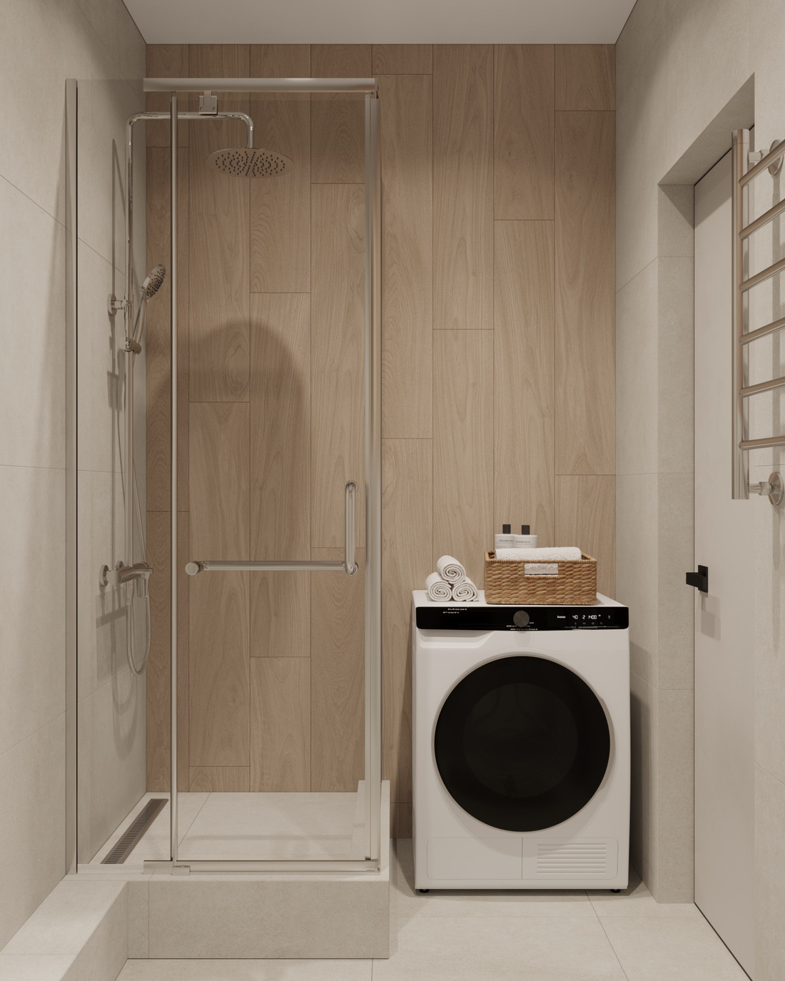 Санузел будет выполнен в универсальных нейтральных тонах. Потолок сделают натяжным. В качестве отделочного материала выбран керамогранит — как серый, так и под текстуру дерева. Интерьер дополнят функциональная мебель со скрытыми полками, стиральная машина и зеркало с подсветкой в черной раме.