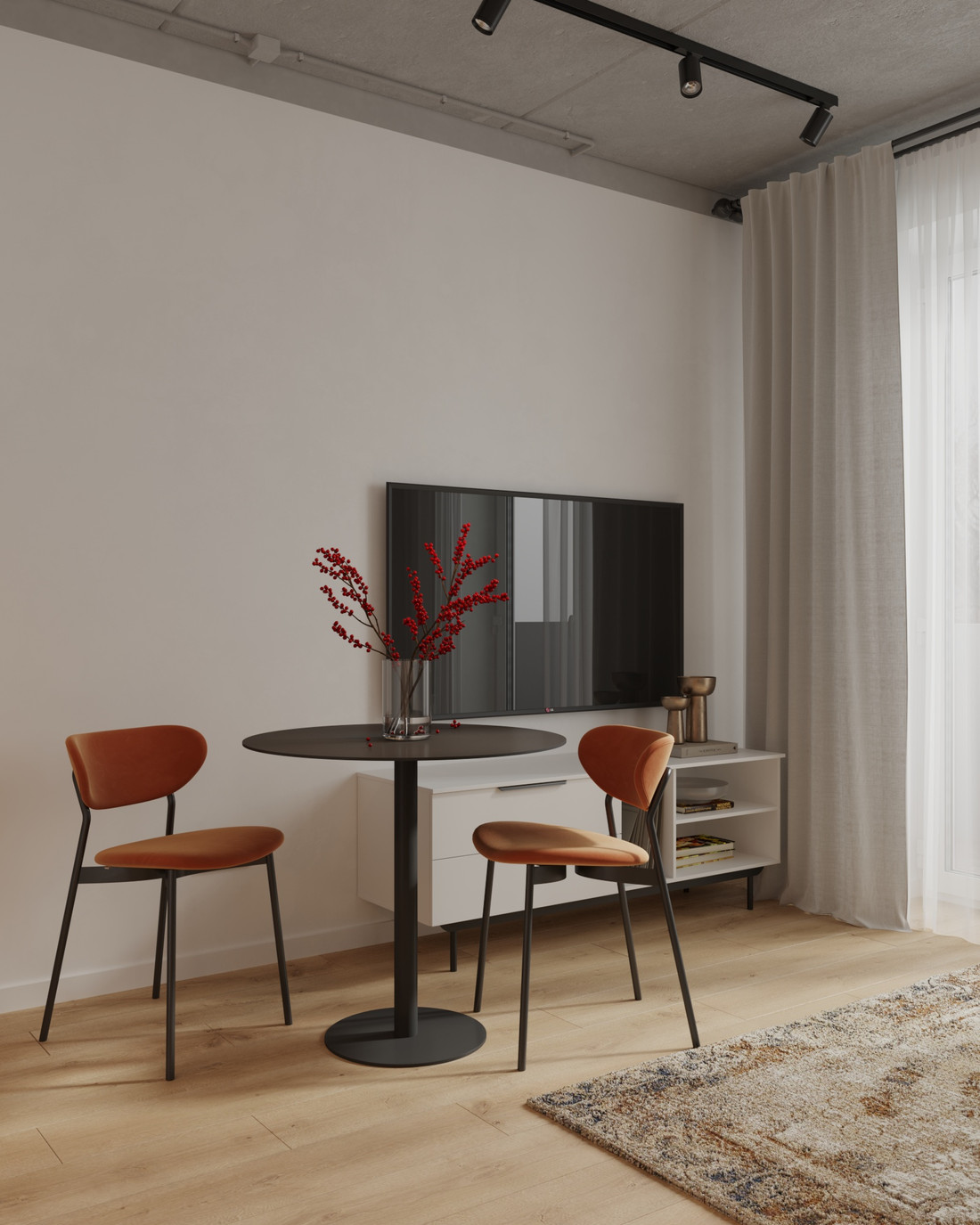 В отделке мини-студий использованы уже знакомые материалы, а также нейтральные тона. Правда, потолок в этот раз решили не трогать и оставить без отделки. Акценты расставили на черной трековой системе, контрастных розетках и проводке, выполненной открытым способом в гофре. Все эти элементы свойственны лофту, который застройщик решил реализовать на компактных «квадратах». По проекту, студии на втором-пятом этажах идут с балконами, на шестом-восьмом предусмотрены лоджии.