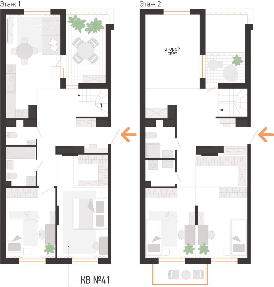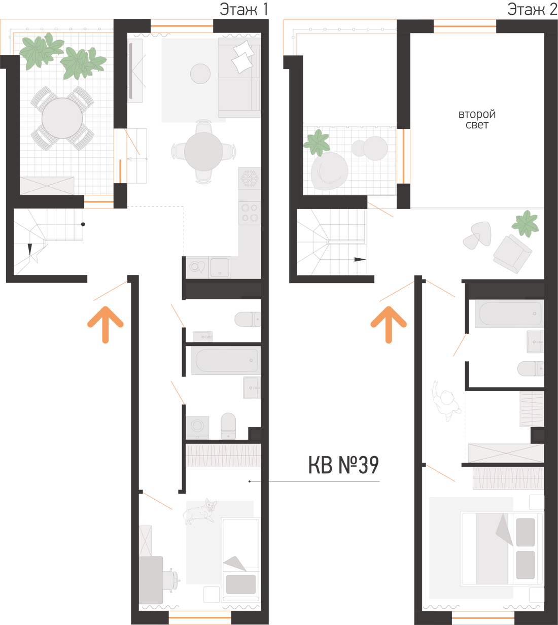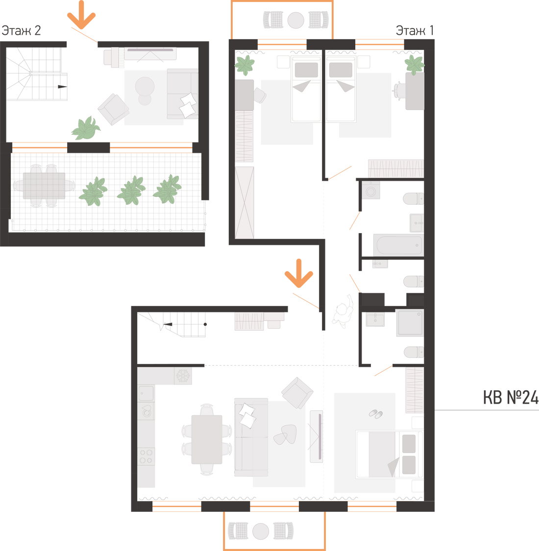 В двухуровневых квартирах предусмотрен отдельный вход с улицы. Те, кто решит их приобрести, смогут выбрать разные варианты планировок: с большим патио на верхнем этаже или двумя террасами либо квартиру с террасой и балконом. Высота потолков в них будет достигать 5,7 метра, на этажах пониже — 2,7. На кровле продумана оранжерея.