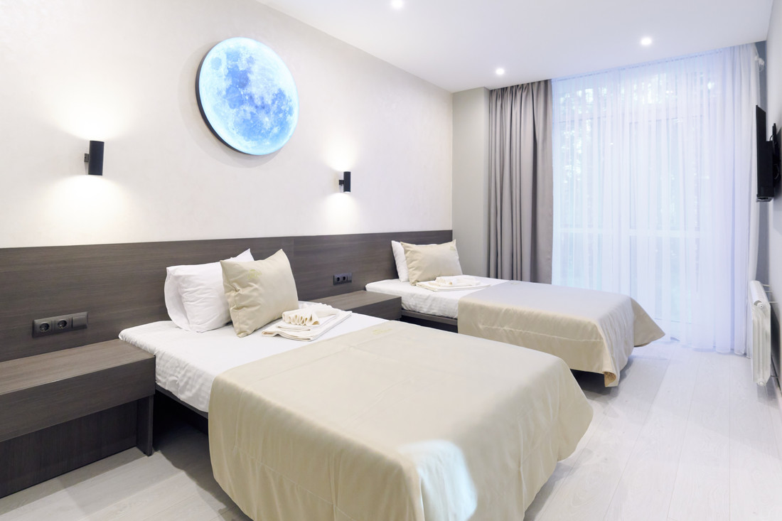 Современное шестиэтажное здание разместилось на площади в 4 тысячи квадратных метров. По проекту в нем находится 62 номера, среди которых 17 двухместных и 45 одноместных. В каждом из них современный интерьер, дополненный панорамными окнами, а также продуманная система кондиционирования.