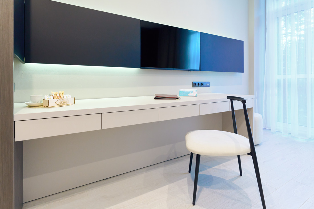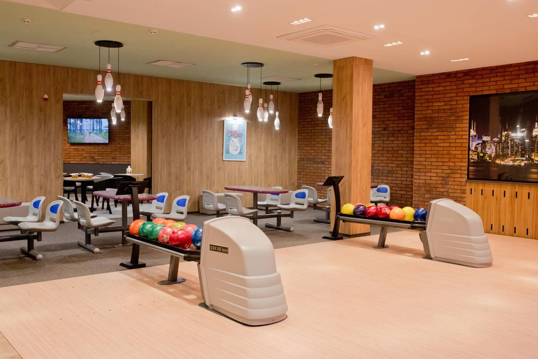 В самом корпусе по проекту находится центральная рецепция, а также кабинеты врачей. На подземном этаже оборудовали зону для отдыха, где есть возможность поиграть в боулинг, бильярд или настольный теннис, а также посетить бар.