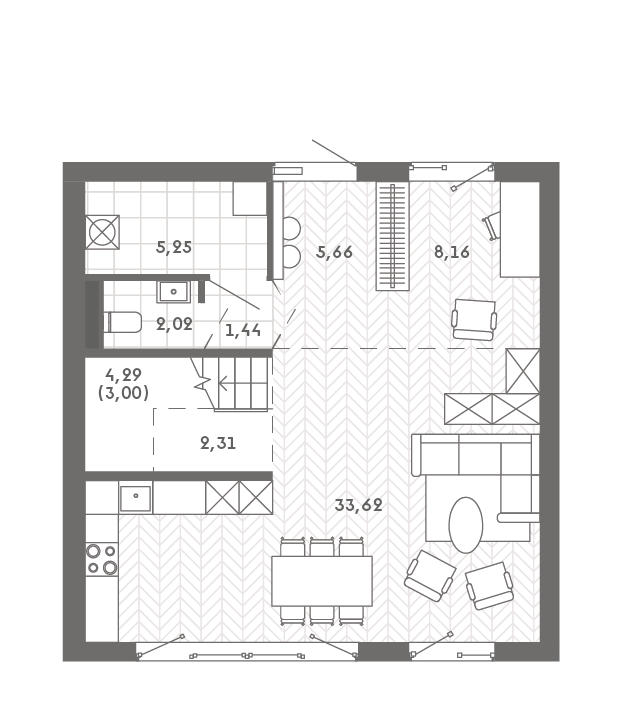 Таунхаус 13.8 по генплану вместит в себя пять квартир с потолками не менее 2,8 м. Их будут сдавать без отделки. На первом этаже запроектированы витражные окна в пол шириной около 3,8 м. Они будут выходить на внутренний участок. На втором этаже окна также сделают большими — с подоконной частью 450 мм.