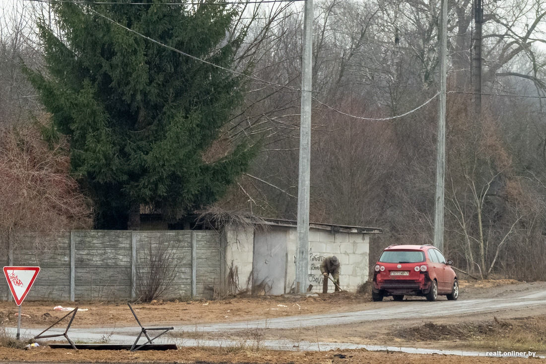 Что видно на площадке сейчас? Символический забор (да и то не везде), выстоявшие хаты и коттеджи, груды мусора на месте тех домов, которые все же были снесены. Красивый тротуар тоже отметим — важная штука.