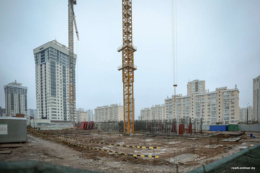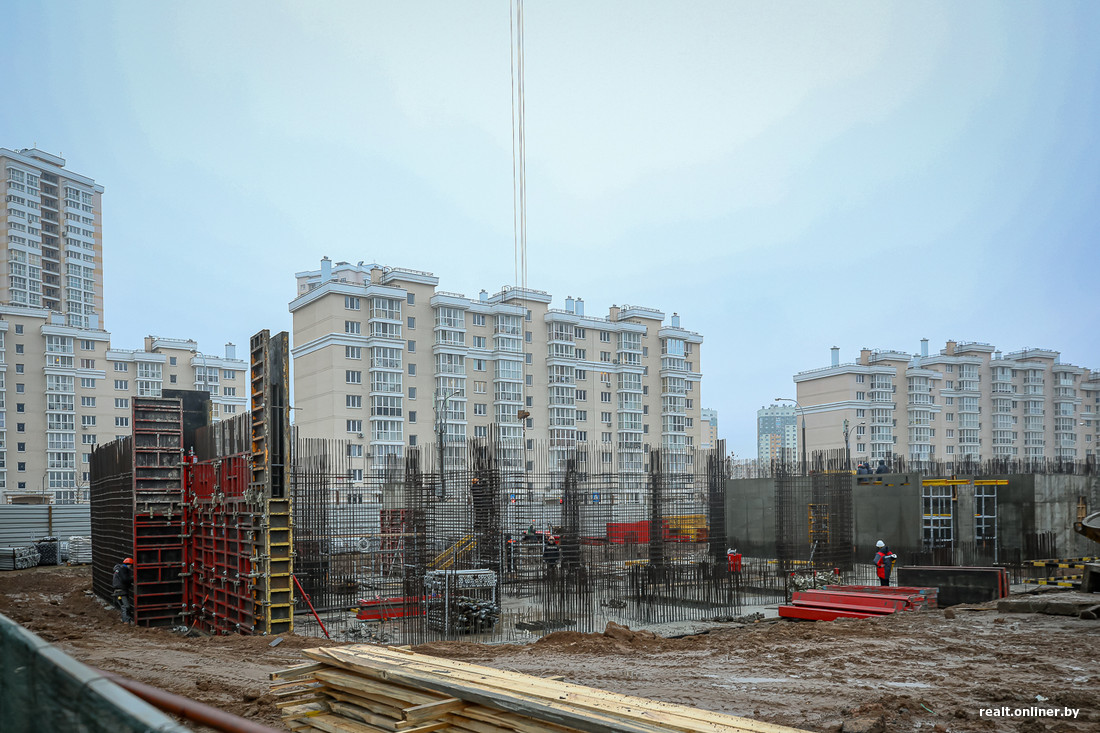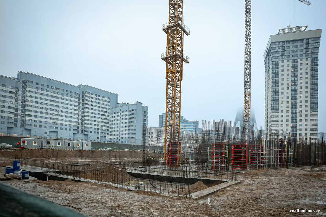 Строительство ведется не то чтобы головокружительными темпами: в середине октября прошлого года рабочие занимались устройством основания дома. Сейчас уже начинает формироваться первый (цокольный?) этаж — из арматуры и немного из бетона. Вероятно, в ближайшее время темп будет нарастать: все-таки два крана на площадке.