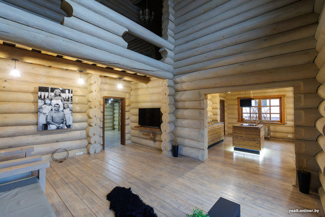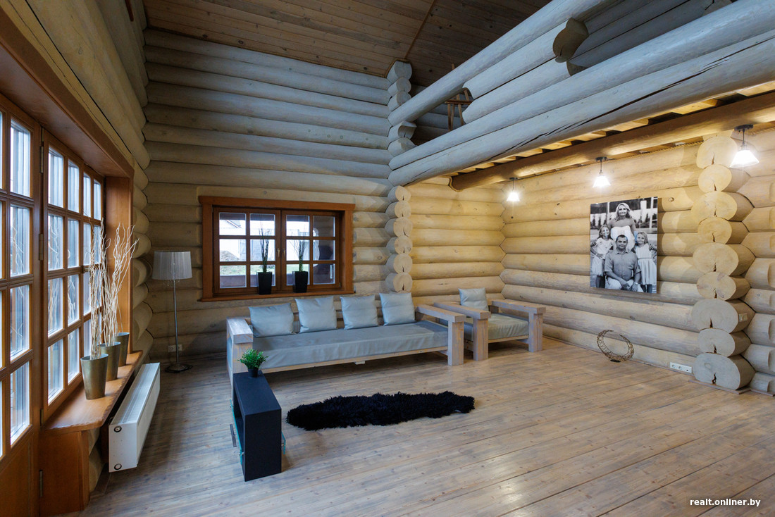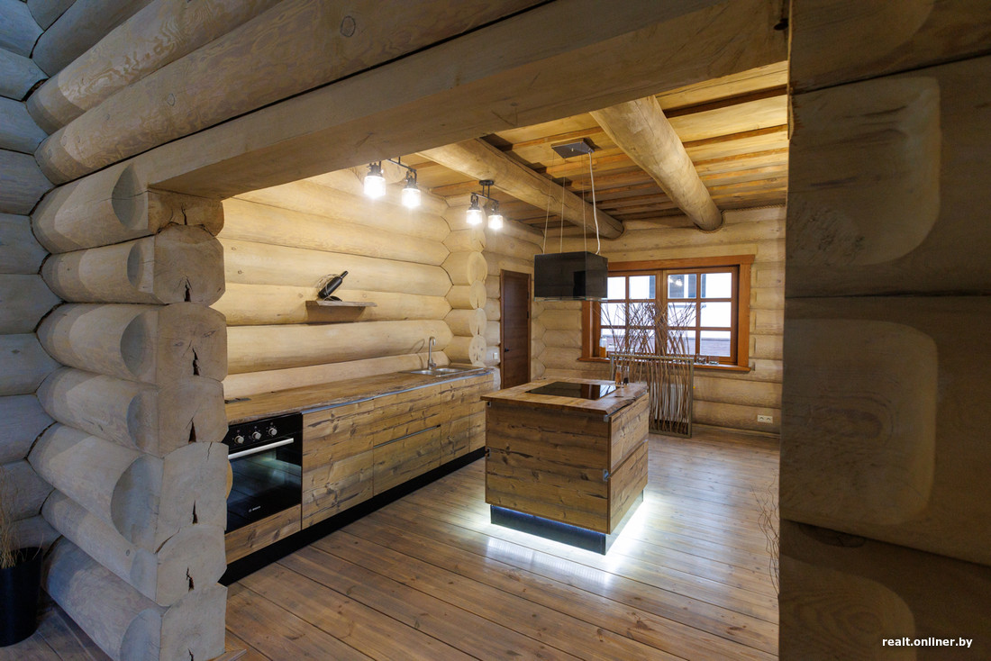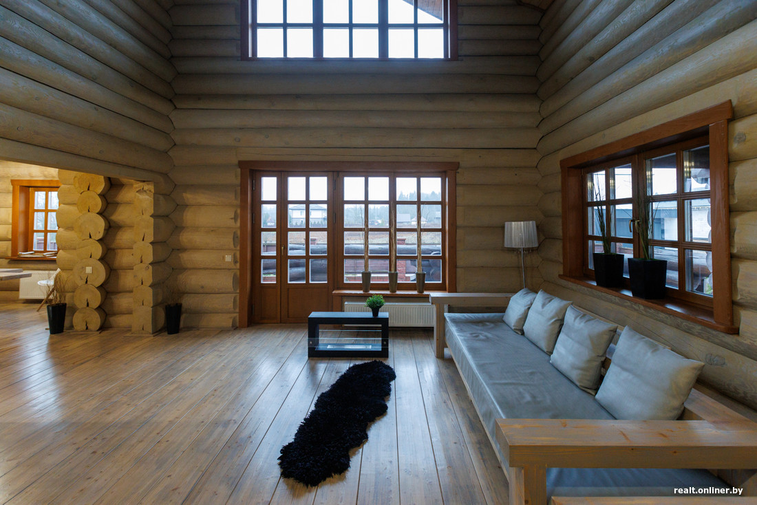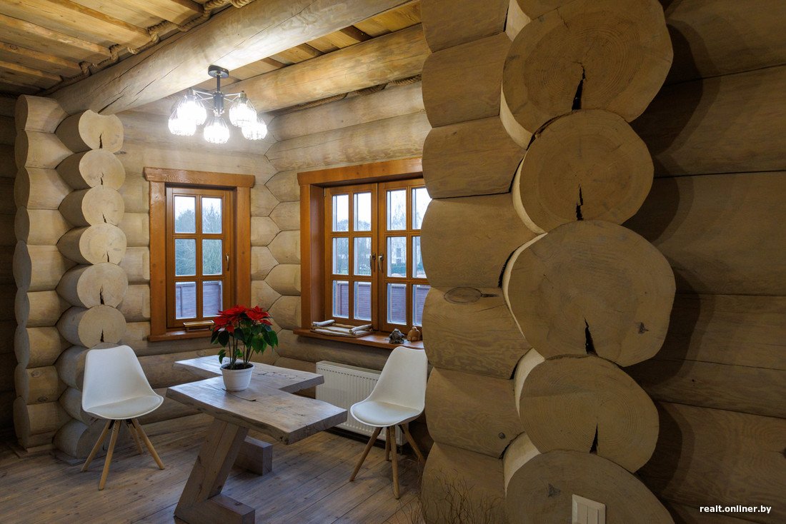 Этот коттедж в базах с объявлениями притягивает взгляд. Все-таки архитектура для наших краев нетипичная. Стены — из очень толстых бревен ручной рубки. В интерьере дерево тоже главный герой. Onlíner побывал в необычном доме и расспросил хозяйку о плюсах и минусах такого жилья.