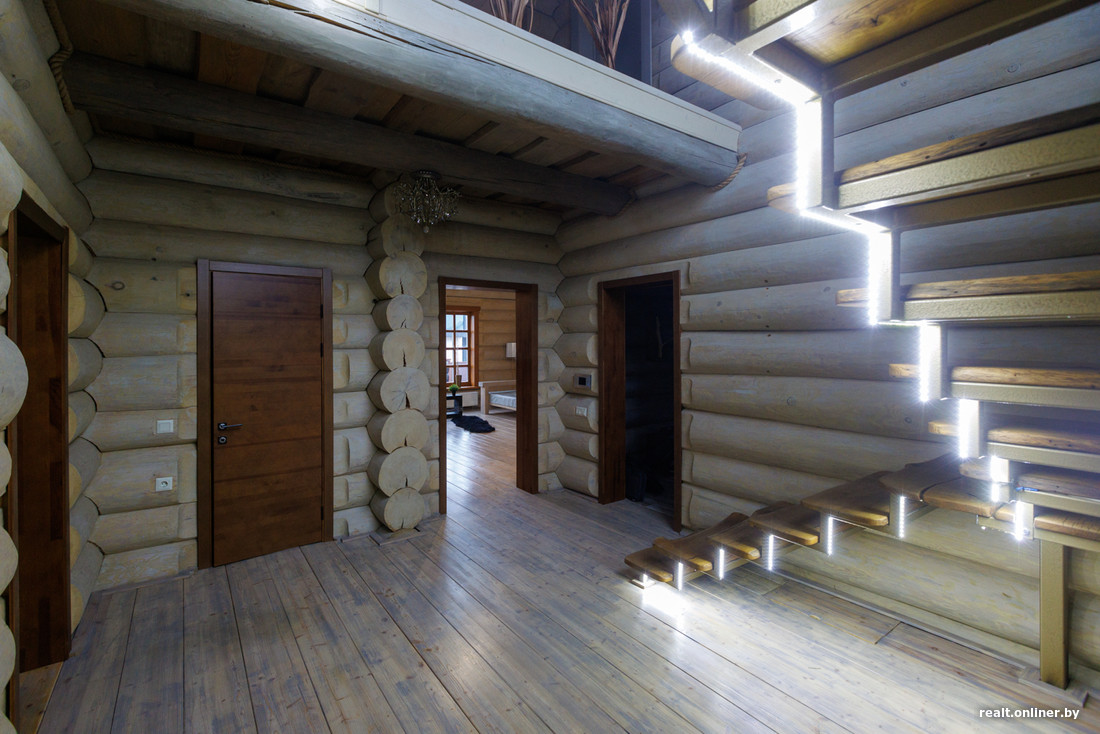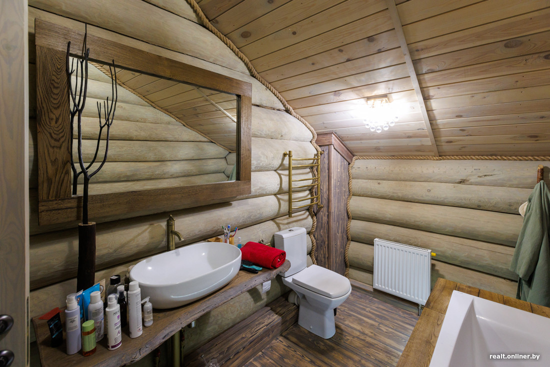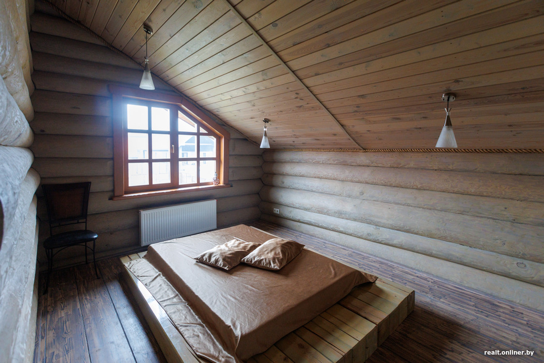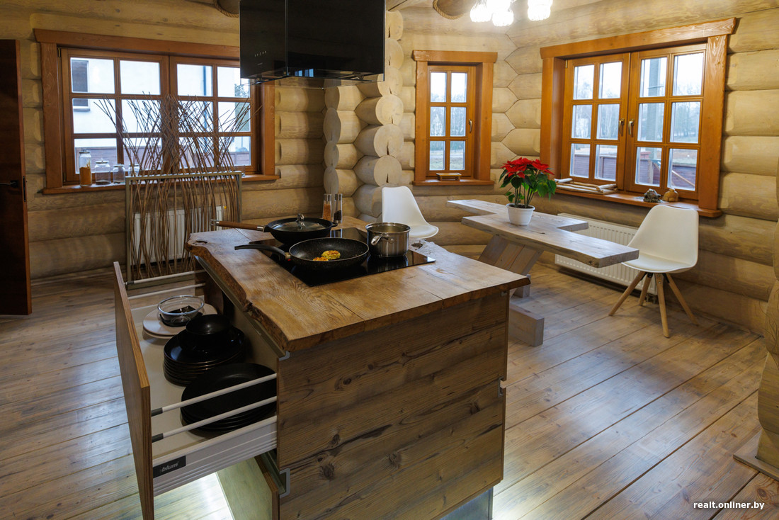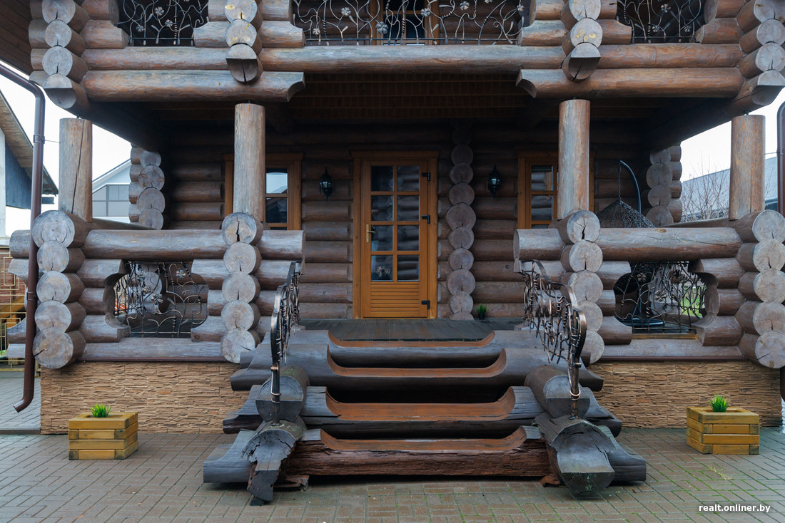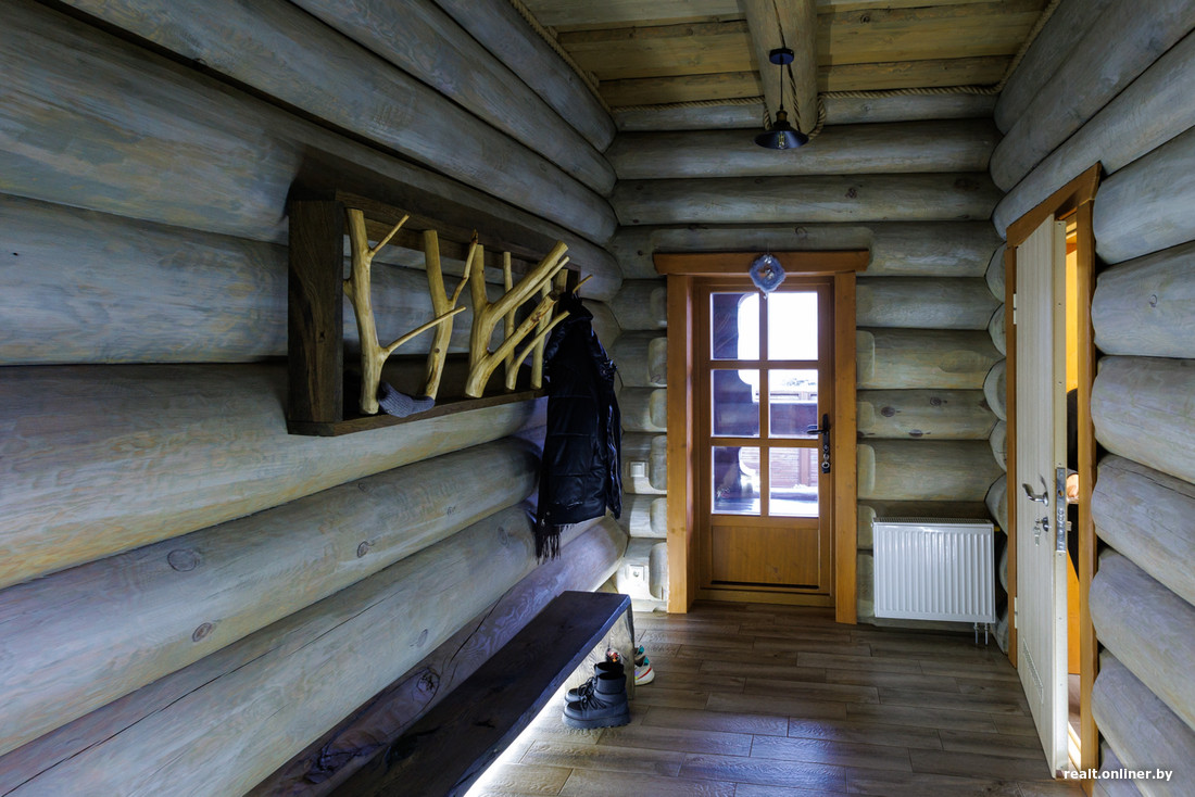 Этот коттедж в базах с объявлениями притягивает взгляд. Все-таки архитектура для наших краев нетипичная. Стены — из очень толстых бревен ручной рубки. В интерьере дерево тоже главный герой. Onlíner побывал в необычном доме и расспросил хозяйку о плюсах и минусах такого жилья.