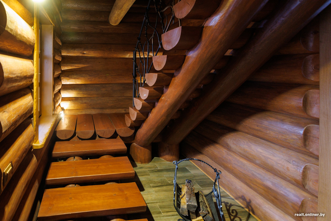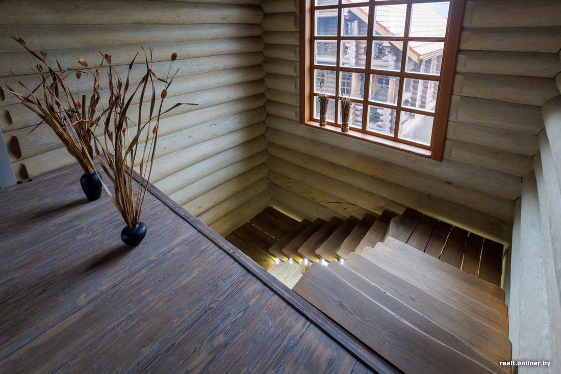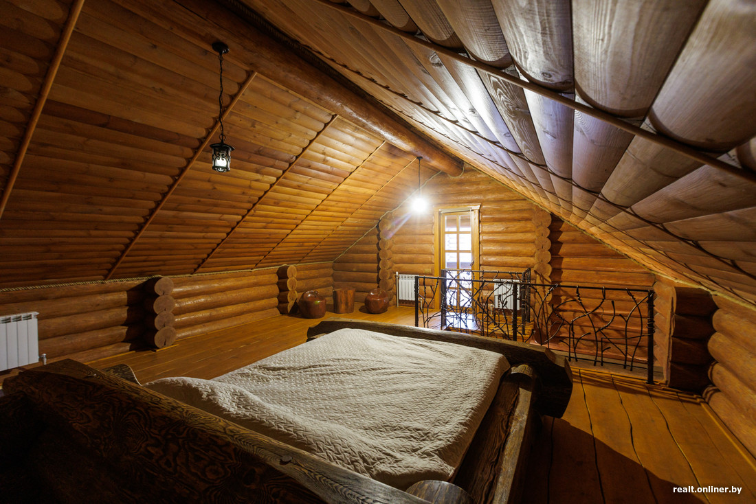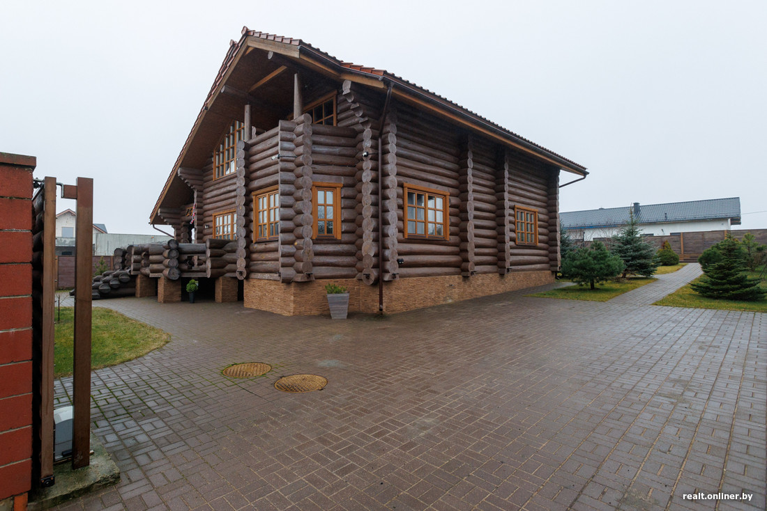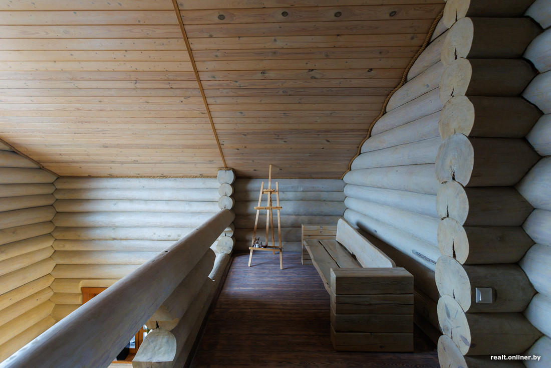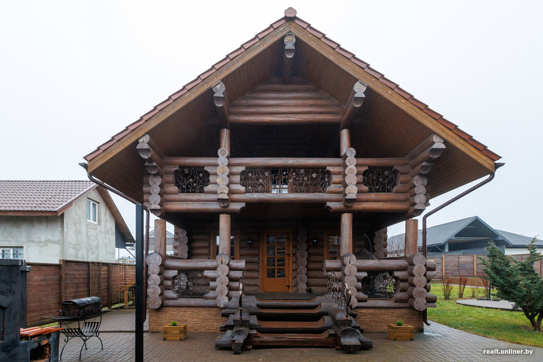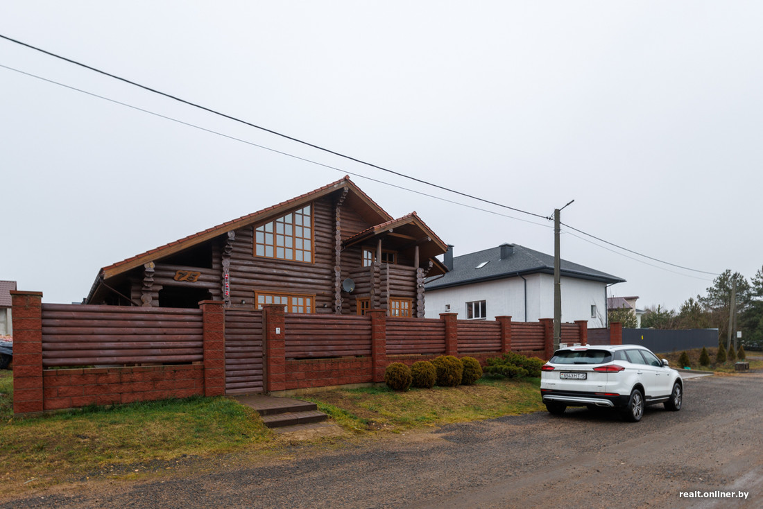 Находится усадьба, выставленная на продажу, недалеко от Минска, в садовом товариществе возле водохранилища Вяча. От МКАД до этого терема из кругляка — не больше 15 километров.