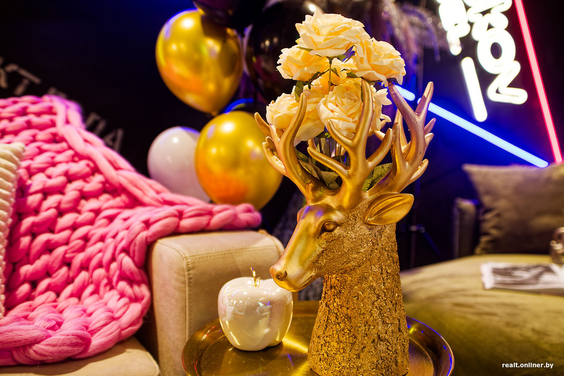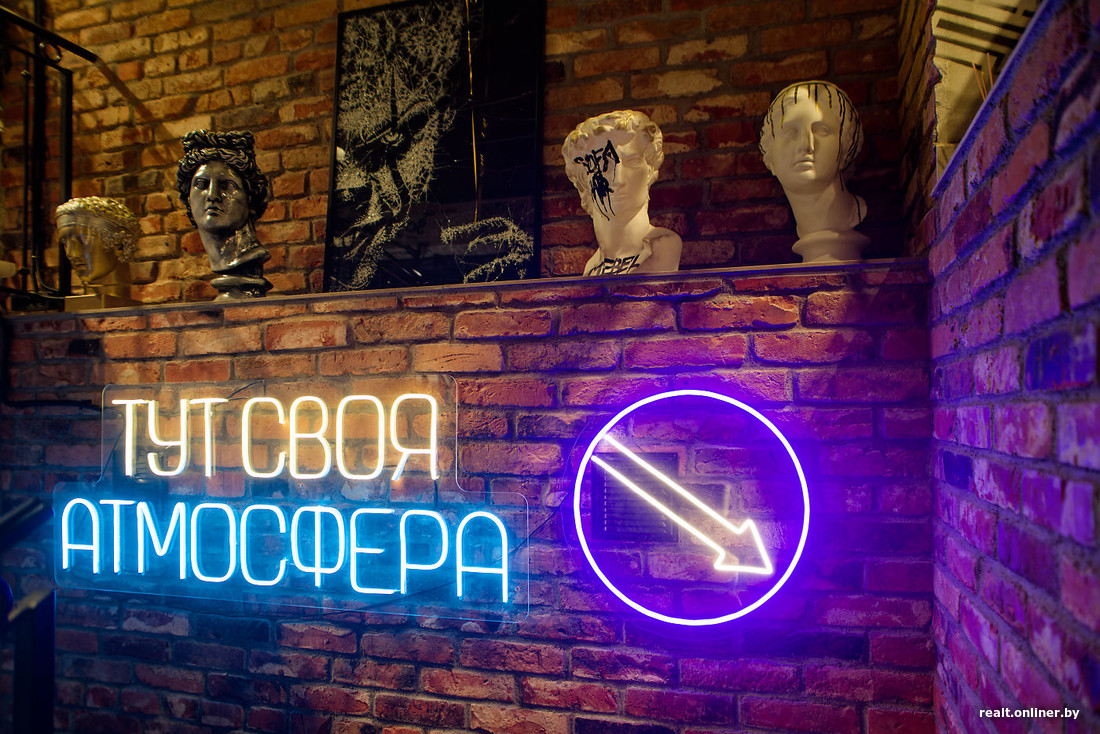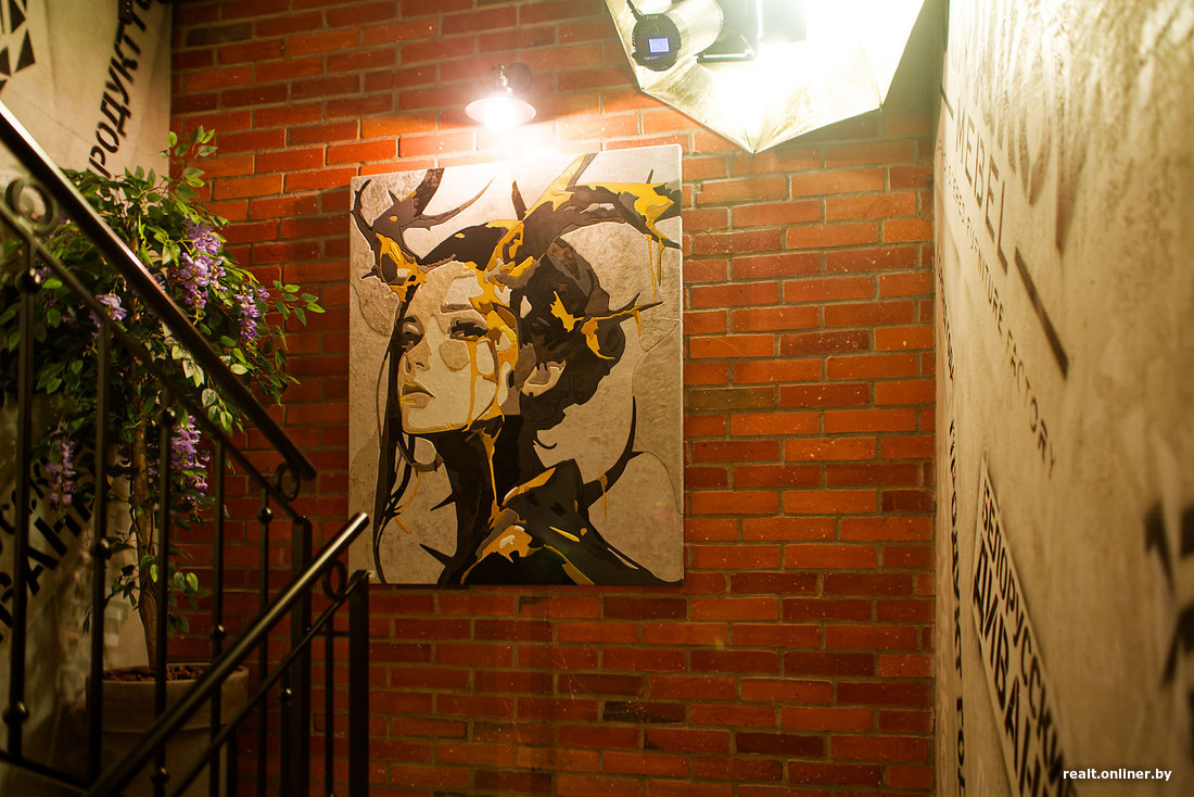 Приспособленное из жилого дома пространство порой диктовало свои решения. Так появилась очень узкая комнатка, размером примерно 2,5×3 метра. Здесь придумали сделать «каминную» с винным стеллажом. Это место тут же облюбовали брестские организаторы романтических свиданий: «Внесем столик, зажжем свечи — и будет как в кино». Продавцы романтики положили глаз и на террасу, выходящую с третьего этажа. Именно здесь в непосредственной близи можно рассмотреть паука и «вечно цветущее» светодиодное дерево.