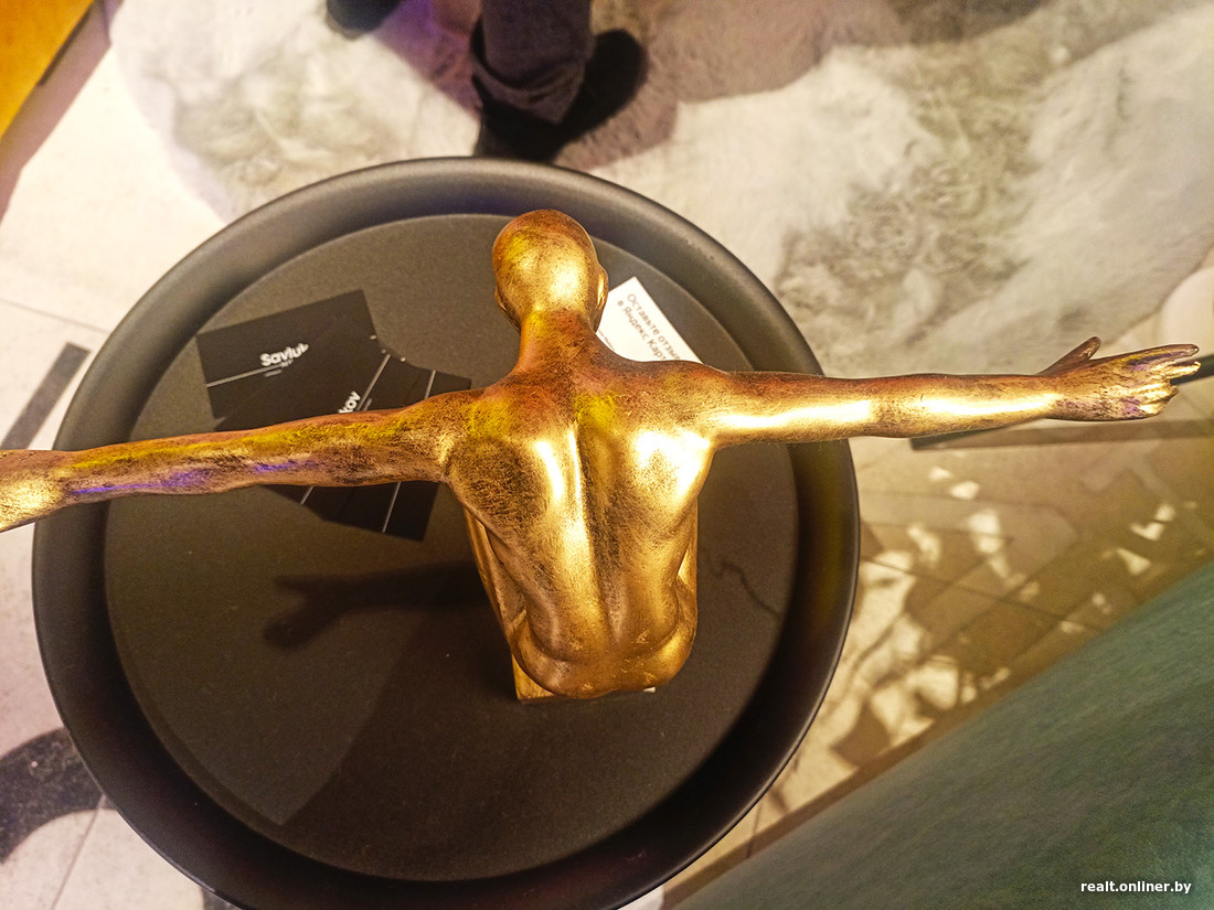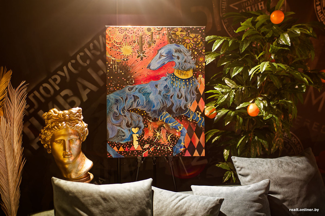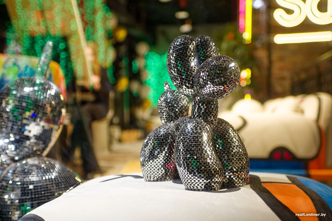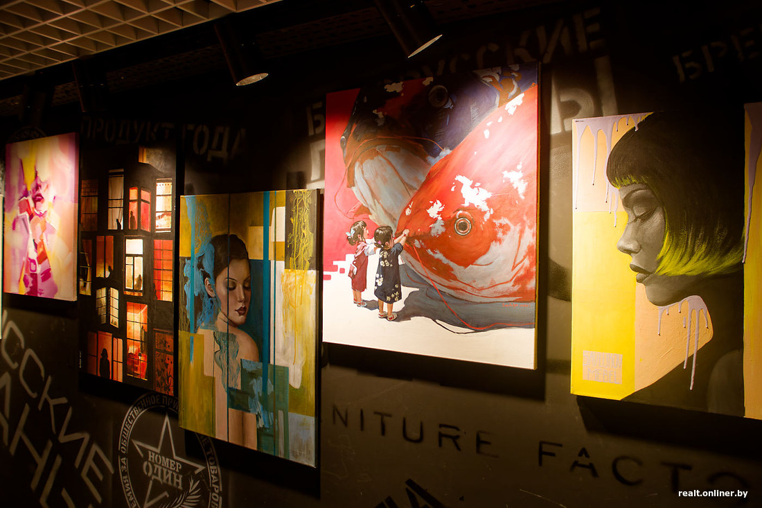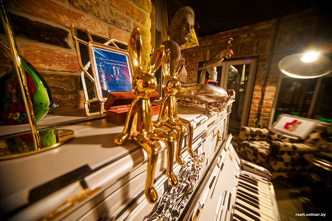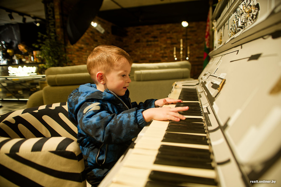 На втором этаже арт-парка устроен своеобразный ресепшен с кофе-баром. Шоколадные конфеты к напиткам разложены в блюдах, креманках и прочей посуде по всем этажам — для посетителей бесплатно. Не скучно подниматься по лестницам дома: в пролетах размещены текстильные картины, сотканные на цифровых станках фабрики. Портрет обезьяны в текстиле перекликается с огромным арт-объектом — гориллой, прибывшей в Брест из Нидерландов. Повсюду — музыкальные инструменты: затейливо выкрашенные немецкое фортепиано и контрабас, видавший виды саксофон. Все можно «пустить в дело».
