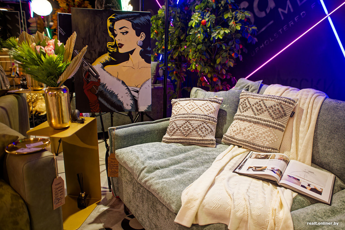 У диванов разместили мебель ручной работы: стол из деревянного спила, заказанный у мастера, ножную швейную машинку (она полностью покрыта зеркальной мозаикой и уже сама стала арт-объектом). Данью моде стал фотобокс с миниатюрами мебели фабрики.
