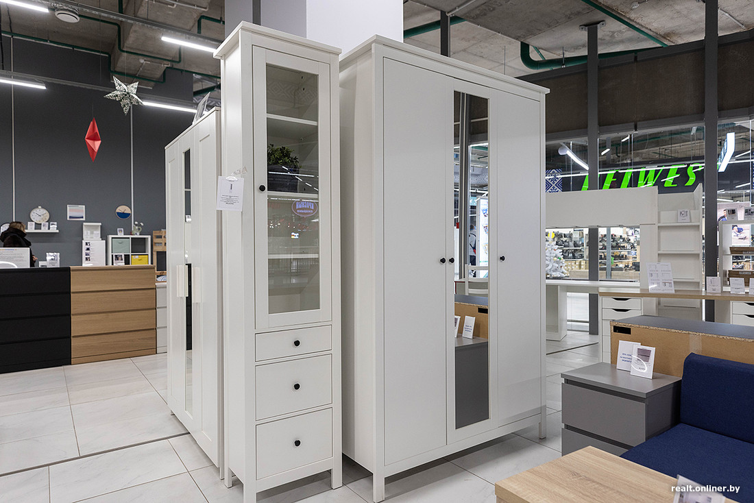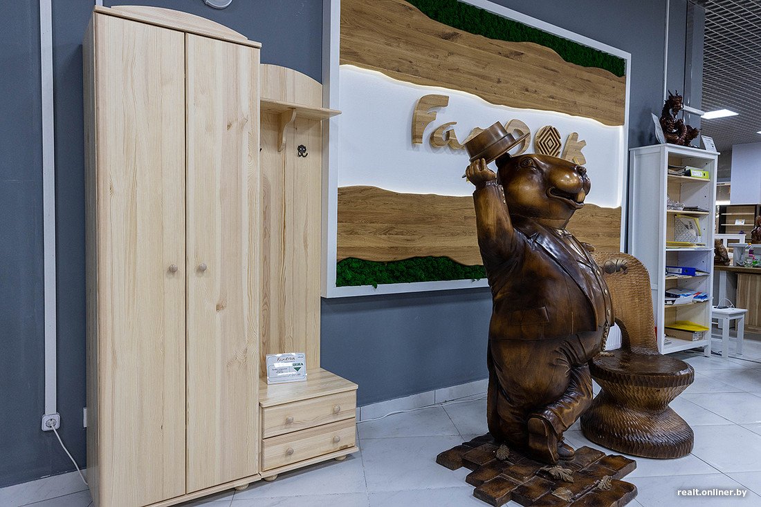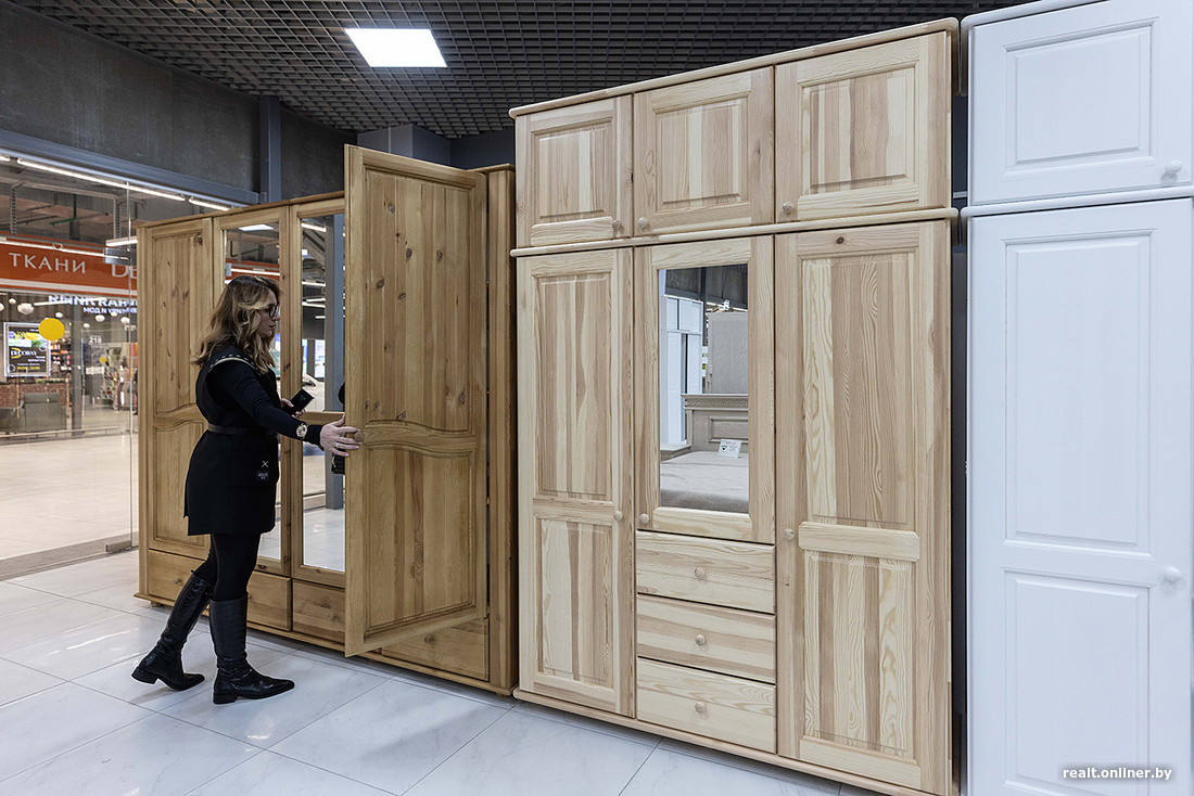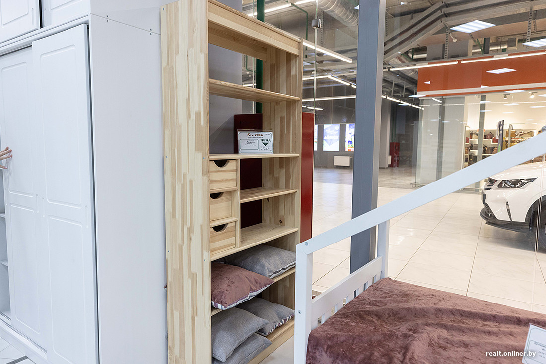 А вот в магазине фабрики «Речицадрев» нас приятно удивили системы хранения. Смотрятся они достаточно современно и даже стильно — есть варианты с фрезеровкой, выпиленными ручками или фигурными фасадами. Стоят в среднем от 700 до 1200 рублей.