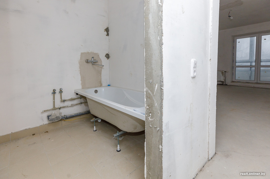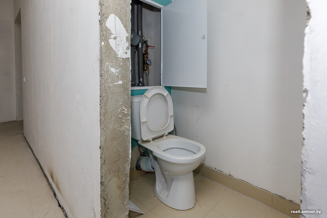 Имеющаяся отделка здесь достаточно аскетичная: бетонные стены и потолок, стяжка на полу. На кухне — одинокая газовая плита, в санузлах — самая базовая сантехника, оставшаяся после застройщика. С этим нам и предстоит работать.