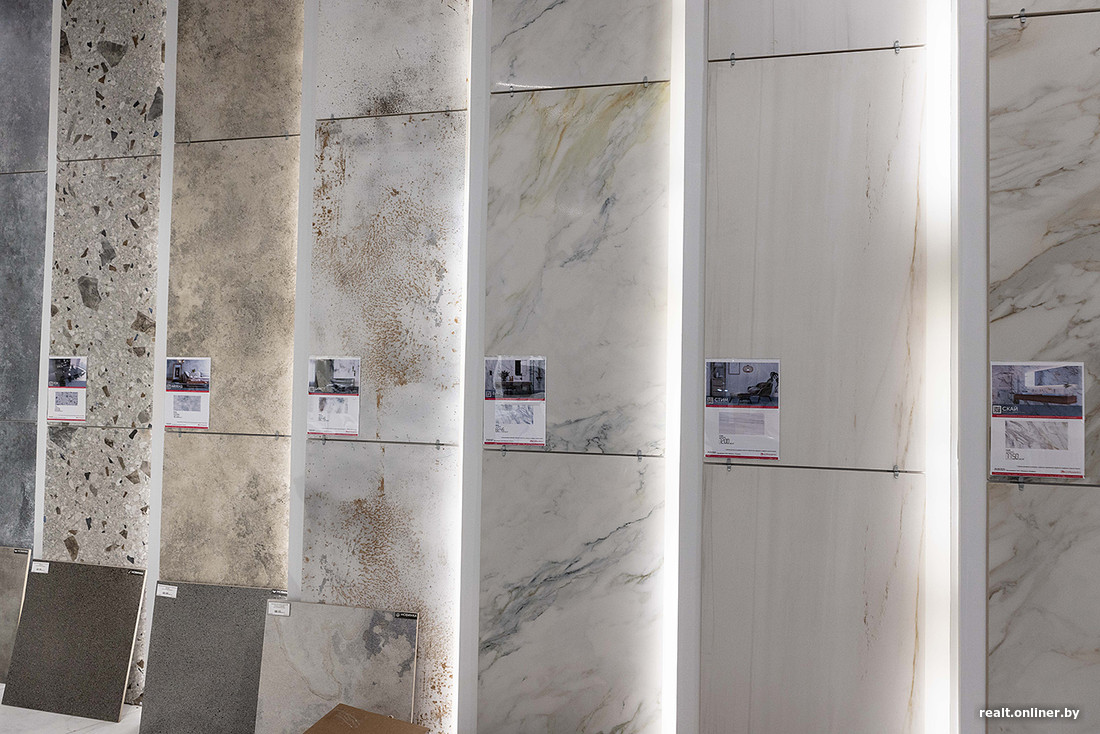 Осталось разобраться с санузлами. Дешевую плитку можно посмотреть в «Березакерамике». Здесь есть керамогранит с базовыми расцветками и текстурами — некоторые экземпляры смотрятся вполне симпатично. Такой материал можно уложить и на пол, и на стены.