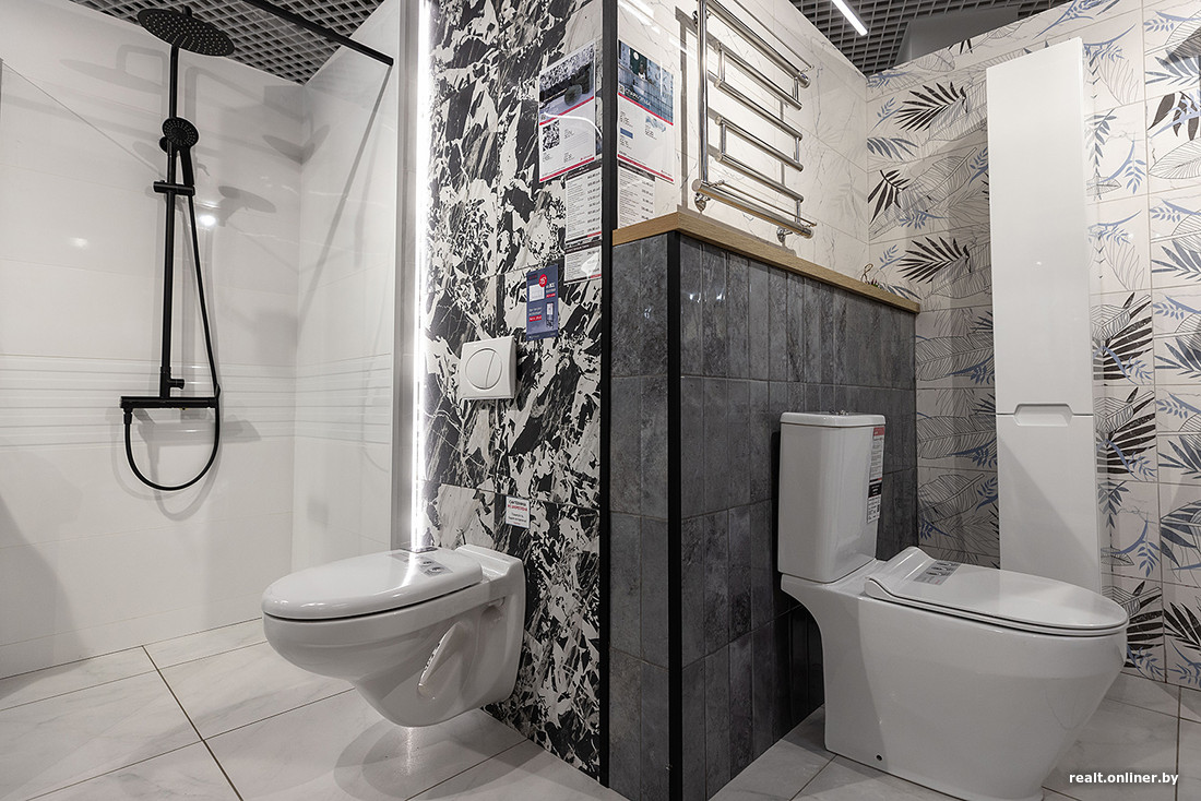 Здесь же можно приобрести и сантехнику, причем есть уже собранные комплекты — унитаз с инсталляцией, душевая кабина со всеми смесителями и т. д.