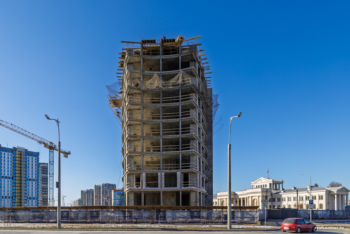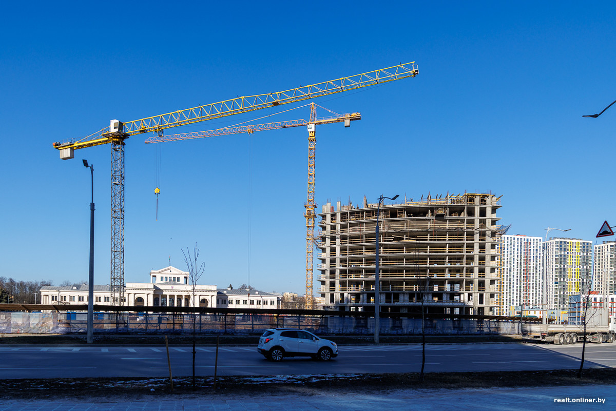 24-й квартал, место для которого выделено прямо за зданием старого аэропорта, пока не обозначен на интерактивной карте «Минск-Мира». Меж тем работы внутри круга ведутся еще с июля прошлого года. И успели значительно продвинуться. Смотрим, как изменились три гектара столичной земли и как удается (удается ли?) увязать новые постройки с историко-культурной ценностью.
