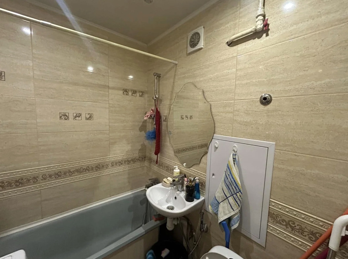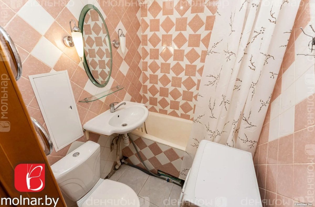 Дощатый пол, обои, ковер на стене и характерные советские секции намекают на то, что ремонт тут делали давненько. Особенно это заметно в ванной. Хотя атрибуты современности тоже присутствуют. Например, здесь есть и относительно свежая мебель: диваны, зеркальный шкаф, межкомнатные двери… Но при желании новый собственник может сделать все с нуля.