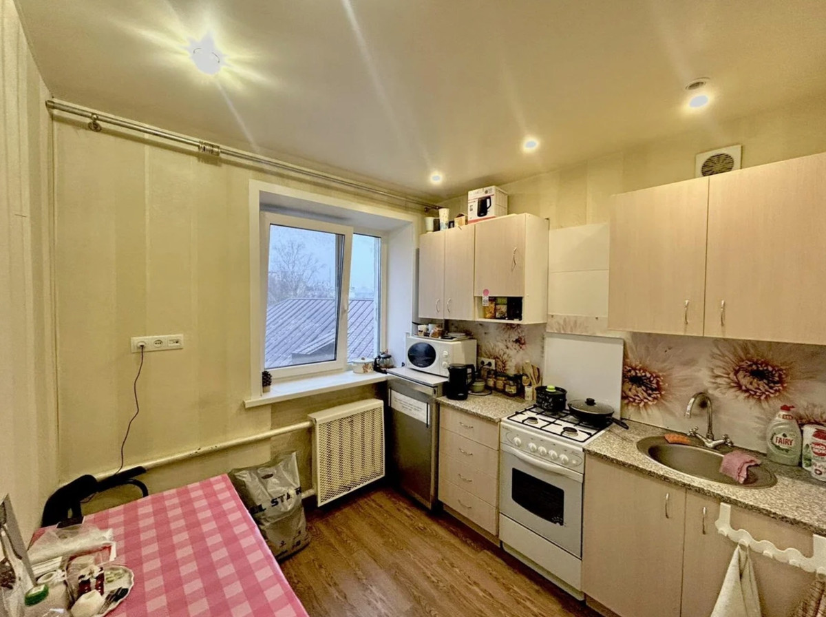 Выглядит очень даже достойно: симпатичные обои на стенах, новенькая светлая кухня, приличного вида санузлы. На наш субъективный взгляд, даже переделывать ничего не придется. Тем более вся мебель и техника достанутся новому владельцу — можно сразу заезжать.