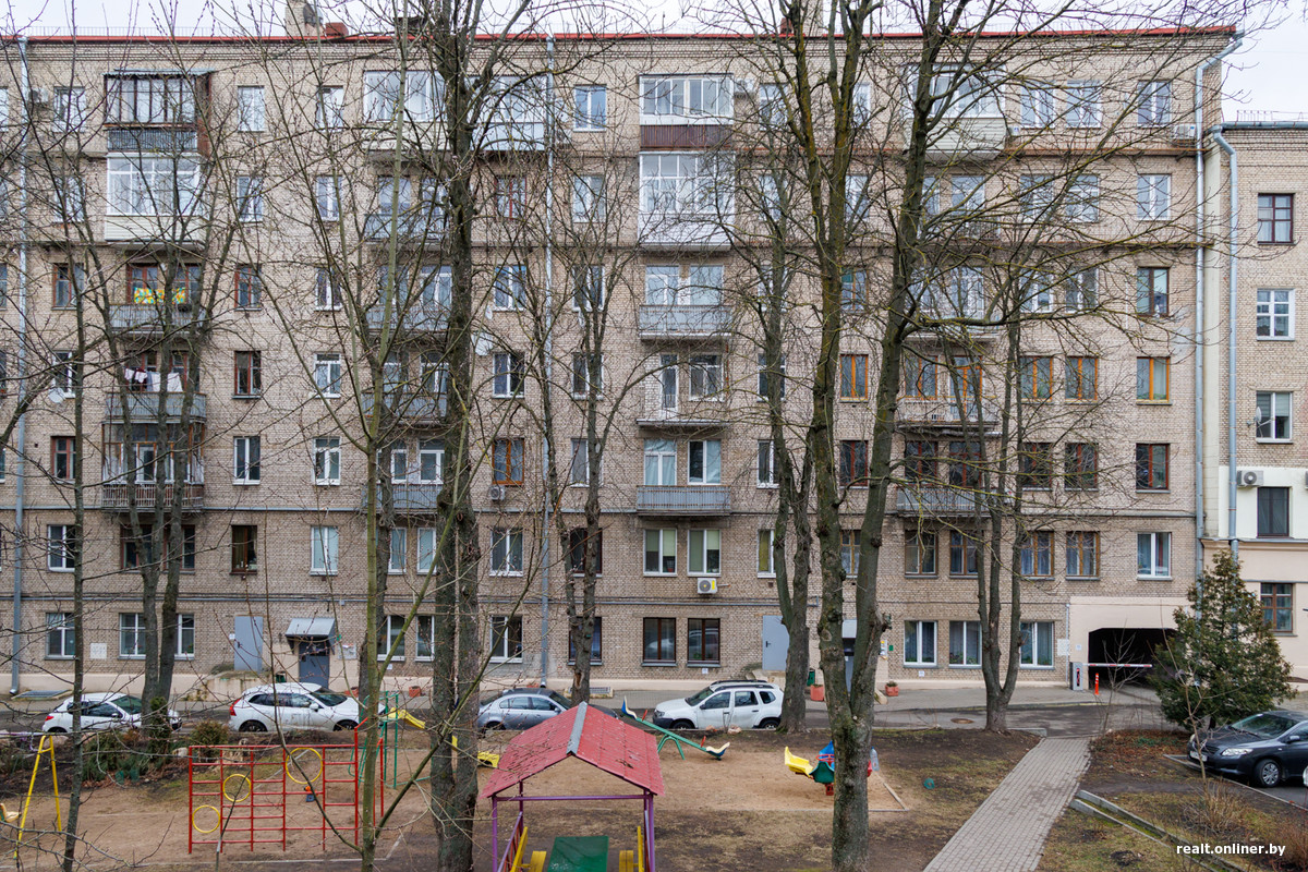 Семиэтажный дом на ул. Янки Купалы, 11 вместил в себя 102 квартиры: по четыре на каждый этаж, кроме первого. Они типовые: с узкими коридорами, трехметровыми потолками и небольшими кухнями. Трешки тут по 80 «квадратов», двушки — по 60. В некоторых есть проходные комнаты, что, в принципе, редкость для квартир, хозяева которых имели особый статус в обществе. Эту сталинку построили за два года по проекту заслуженного советского архитектора и преподавателя Виктора Волчека. С 1953 года он работал главным архитектором проектов института «Белгоспроект». Кроме сталинки вблизи проспекта он успел спроектировать и объекты, которые мы видим каждый день. Например, здание облисполкома на Центральной площади и Литературный музей им. Янки Купалы.