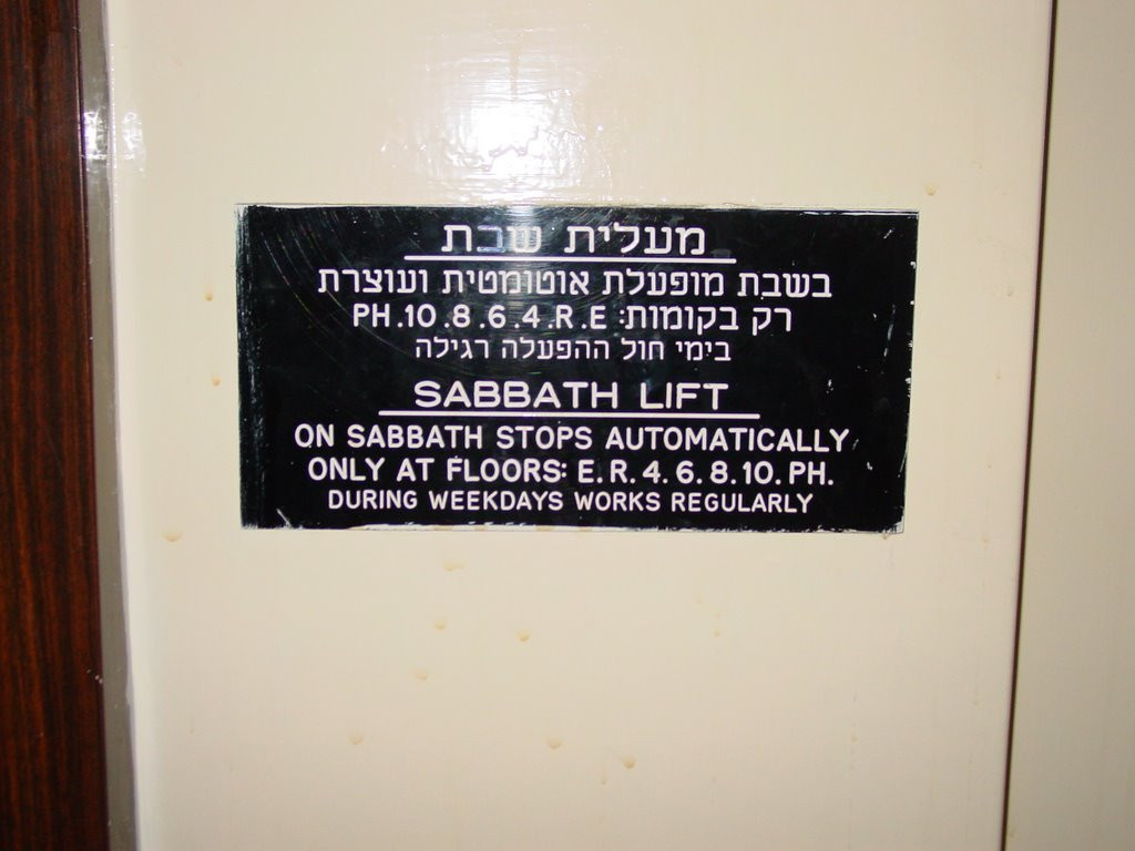 В Израиле, а также в других местах, где компактно проживают евреи, или в зданиях, предназначенных для использования гражданами, исповедующими иудаизм, можно встретить лифты, помеченные словом «Шаббат». Их называют шаббатными, или субботними, и они специально настроены так, чтобы соответствовать конкретным религиозным убеждениям. Для многих евреев любая работа в субботу, святой праздник, греховна. Включая разведение огня. К этому приравнено и нажимание кнопок или переключателей на электрооборудовании, вызывающее замыкание контактов цепи. Но пользоваться уже включенным электрооборудованием в большинстве случаев дозволяется.