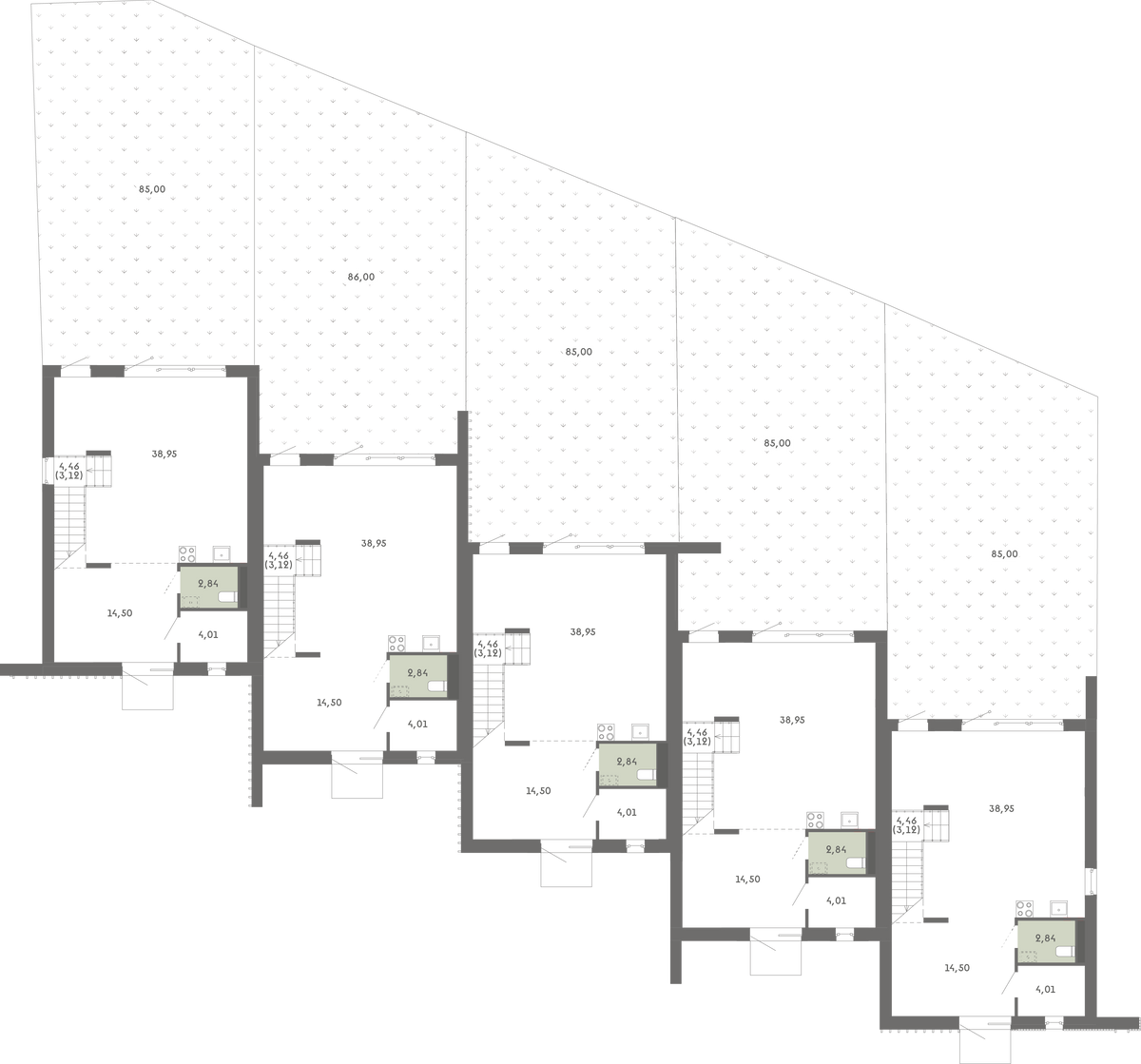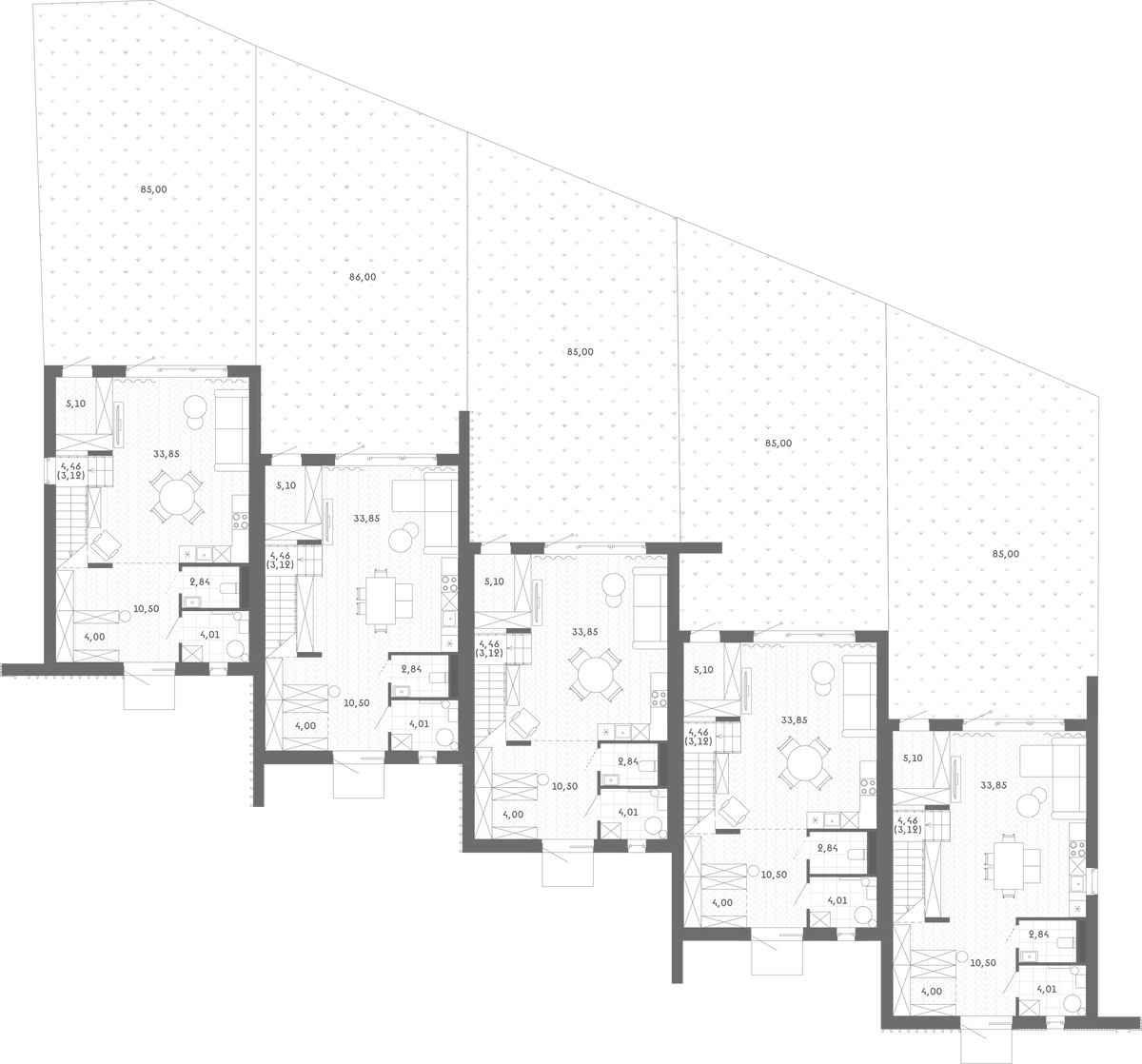 Сам таунхаус представляет собой двухэтажный монолит с плоской кровлей. Дом расчитан на 5 просторных квартир площадью 134 квадратов без внутренней отделки. Главной особенностью первого этажа станут панорамные витражные окна высотой 2,5 метра и шириной около 3620 мм. Из них откроется вид на приватные участки площадью 85—86 «квадратов».