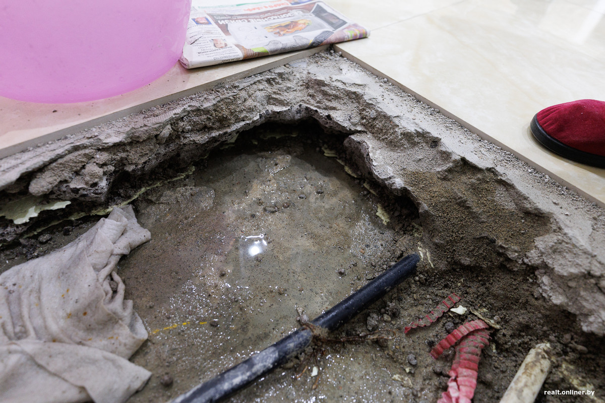 На прошлой неделе в квартире супругов сняли плитку и демонтировали стяжку в самом мокром, по данным влагомера, месте — у входной двери. Лужу действительно обнаружили. Более того, она неиссякаемая — по чуть-чуть наполняется, даже если отопление отключено. Если же в трубы дать давление и воду, то не будешь иметь ни минуты покоя — придется постоянно вычерпывать жидкость. О ночном сне или том, чтобы уйти из дома на полдня, можно забыть. Влажной оказалась стяжка и со стороны подъезда (там пол тоже частично вскрыли).