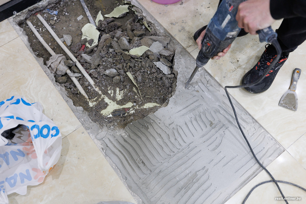 Конечно, первыми под подозрение у специалистов попали именно трубы отопления. Поэтому их и было решено осмотреть. Вскрытие двух плиток у двери ничего не дало (кроме обнаружения лужи). Поэтому вчера демонтаж продолжился: специалист «взорвал» пол в том месте, где треснула одна из плиток, и продолжил разбор самого мокрого «угла».