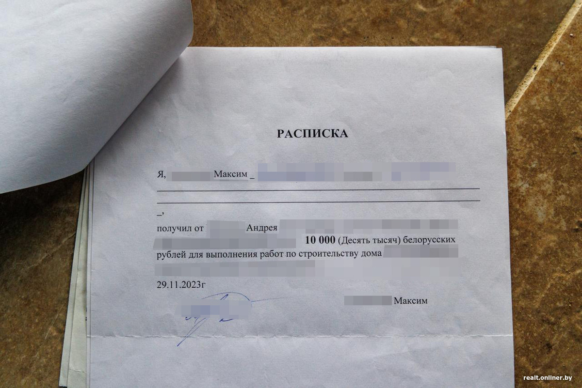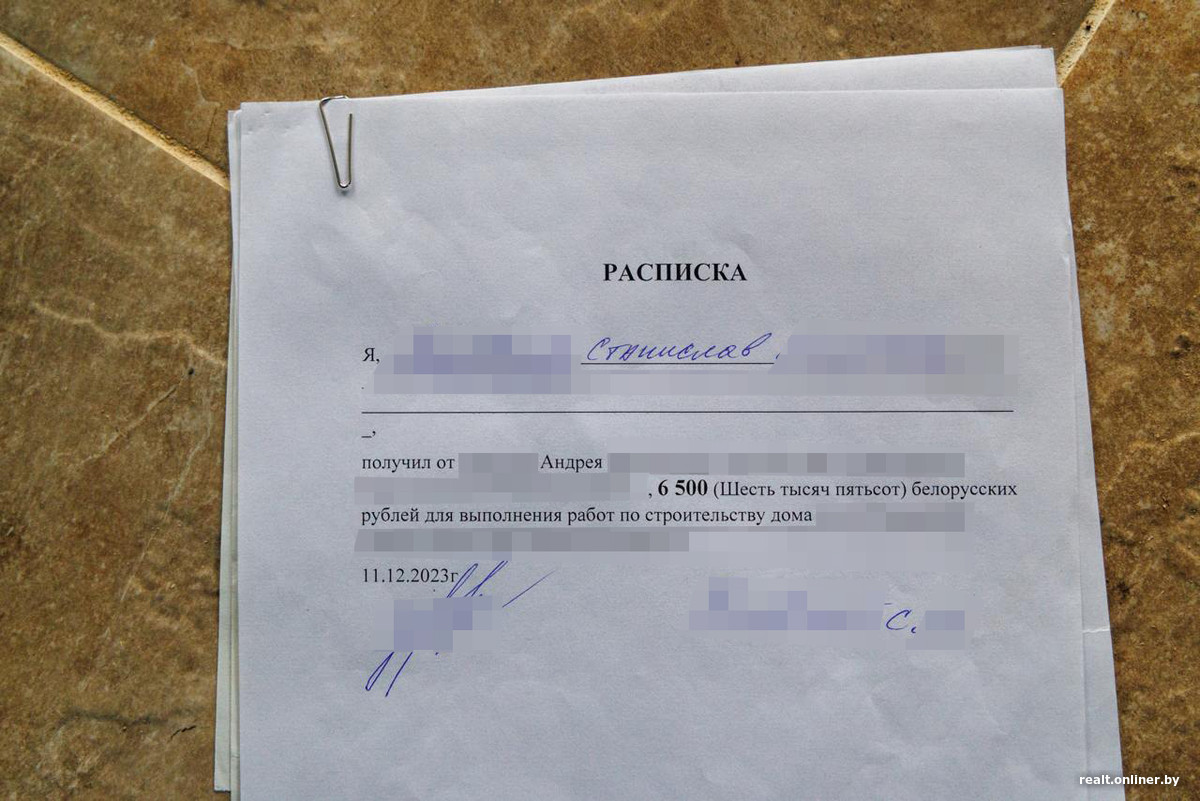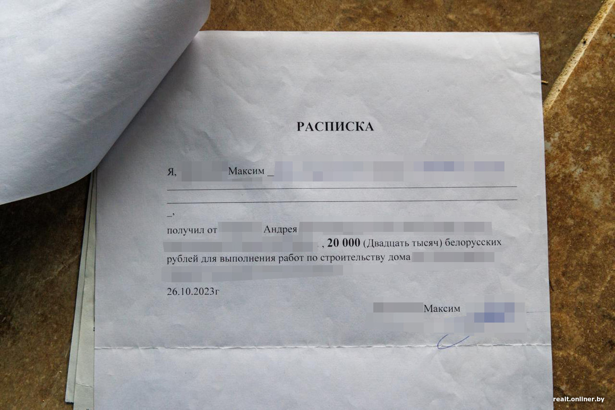 Пропорционально суммам в расписках уменьшалась и стоимость строительства дома по договору. Так, до конца 2023 года я передал им (расписки оформлялись как на Стаса, так и на Максима) 6500 рублей, 10 000 рублей и 20 000 рублей. То есть договор «похудел» до 44 294 рублей, — перечисляет Андрей.