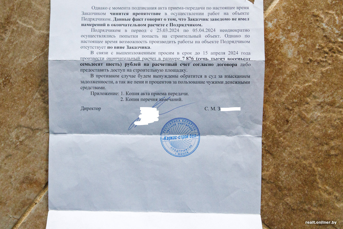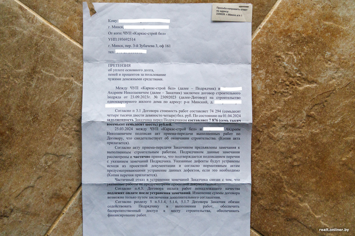 Поскольку они упорно не исправляли «косяки», я нашел вариант решения вопроса: составил список всех проблемных моментов и предложил закрыть на них глаза, но за это не доплачивать оставшиеся 7900 рублей. Стасу такой вариант не подошел. В ответ он выслал мне свою претензию, требуя заплатить всю сумму. Это меня, откровенно говоря, уже разозлило, — делится переживаниями минчанин.