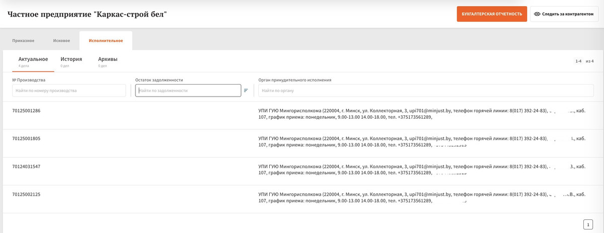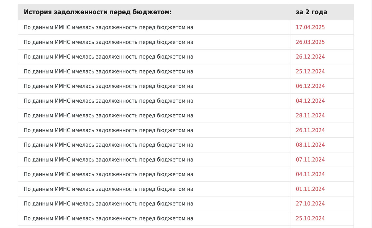 Благодаря сервису kartoteka.by мы узнали любопытную информацию о компании. В настоящий момент на «Каркас-строй беле» висит четыре исполнительных производства. К сожалению, общая сумма долга неизвестна. Но если сложить иски Андрея и Валерия, уже получаем около 80 000 рублей. Также организация может похвастаться целой «летописью» долгов перед бюджетом.