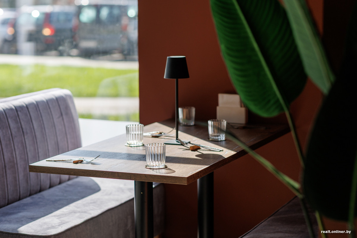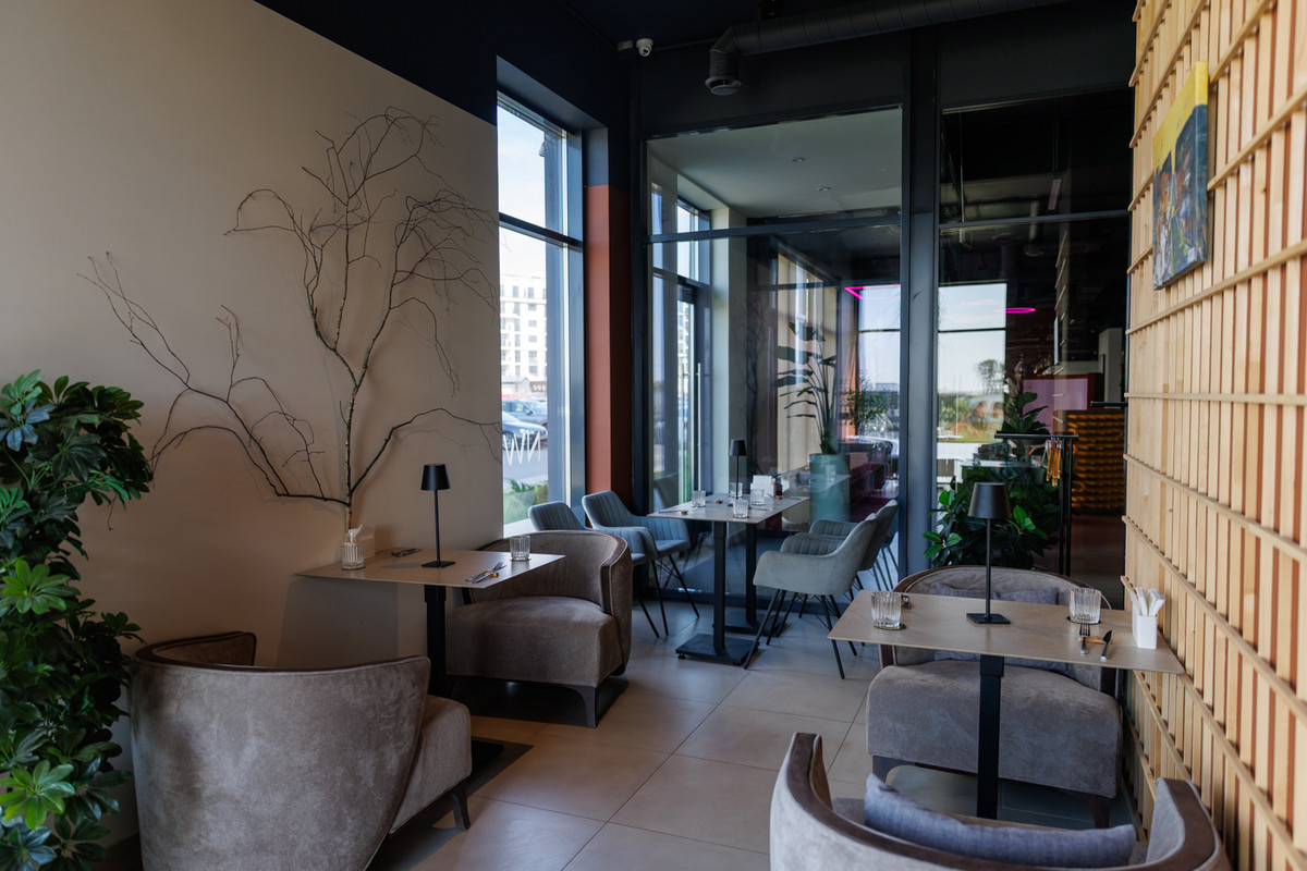 Кафе получилось довольно просторным — 130 кв. м. Оно разделено на два зала — помещение около входа имеет кофейный вайб, а дальнее пространство больше похоже на ресторан. Единовременно заведение может принять до 32 человек. На улице стоят пару столиков, но скоро появится полноценная терраса.