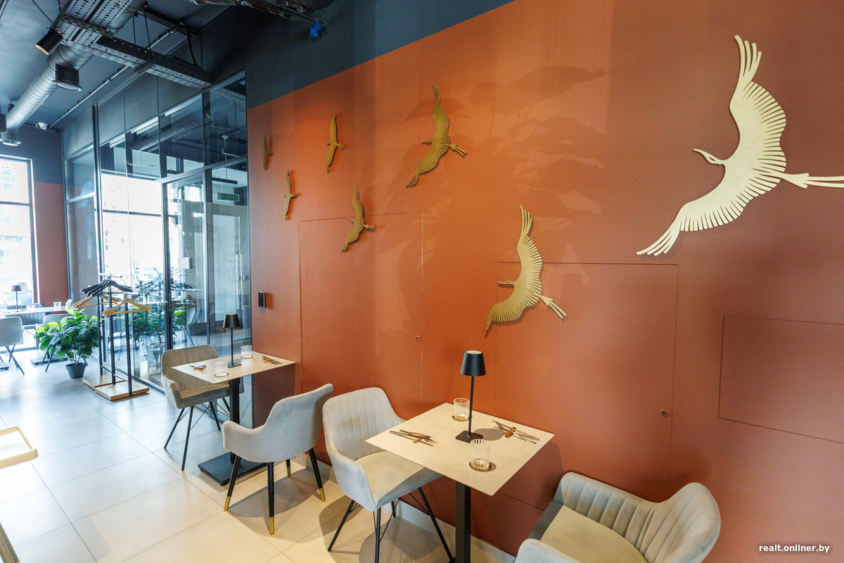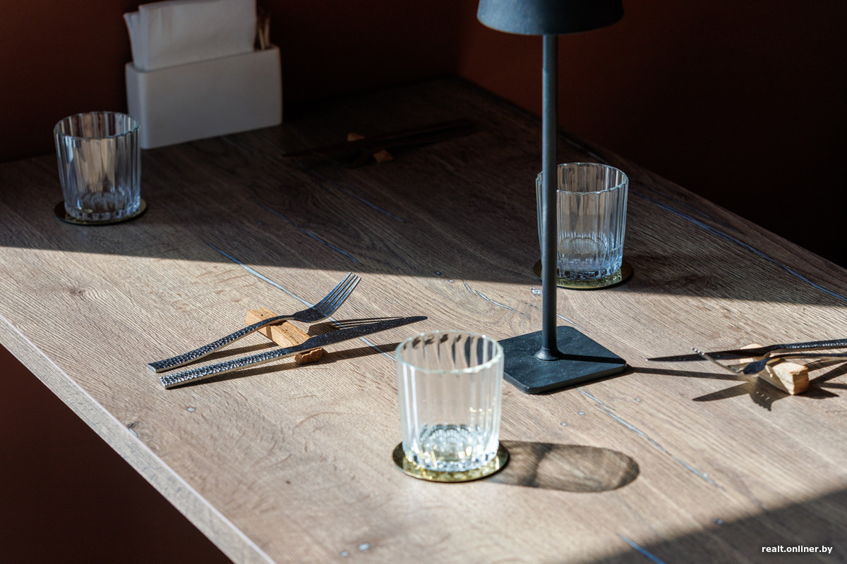 — Именно из-за парка в нашем кафе можно найти элементы березы на стене, на светильнике. А около бара можно увидеть «березовое облако». Вечером, когда свет включается, тень от облака рисует красивый контур березы на полу. На столах под приборами находятся настоящие деревянные щепки из вишни и тика.